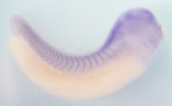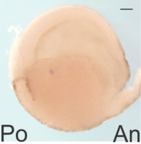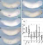 e2f1 (E2F transcription factor 1) gene expression in bissectted Xenopus laevis embryo, assayed via in situ hybridization, NF stage 16, lateral view, anterior right, dorsal up. |