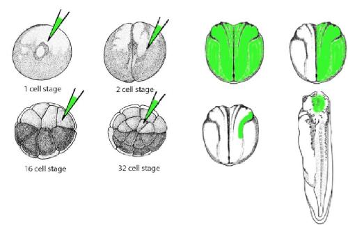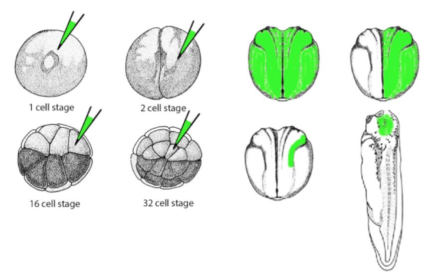 Schematic depicting spatial control of mRNA or MO location in a Xenopus embryo. GFP mRNA or fluorescent dye can be injected along with a particular mRNA or MO in specific blastomeres at various stages of development to spatially restrict protein expression or knockdown, respectively. The target area can be assessed by epifluorescence microscopy