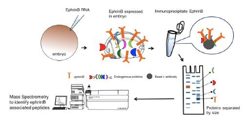 Schematic depicting the use of immunoprecipitation and mass spectrometry to identify possible ephrinB-associated proteins. Xenopus embryos are injected with ephrinB mRNA, cultured until later stages, lysates prepared, and ephrinB immune-complexes collected. Proteins are separated by gel electrophoresis, gel slices removed and prepared for mass spectrometric analysis to identify proteins in the immune-complex