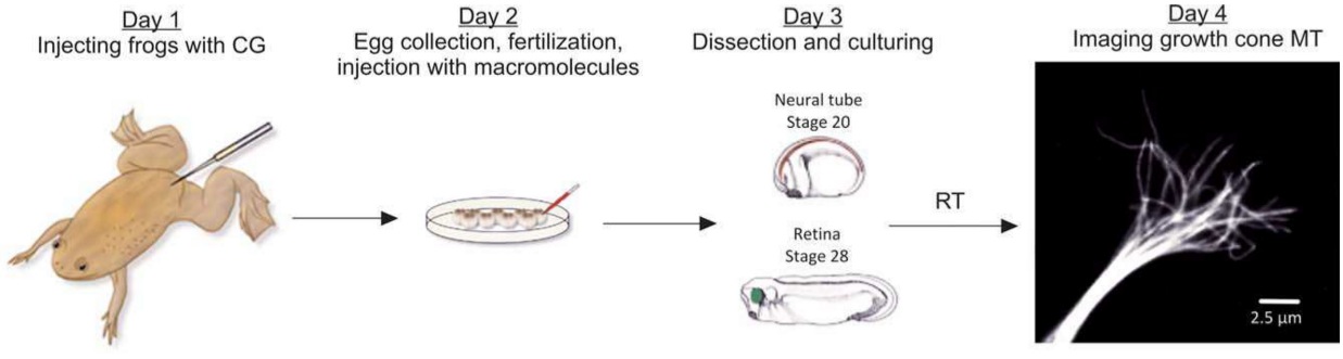 The model system, Xenopus laevis, has been used in innumerable research studies and has contributed to the understanding of multiple cytoskeletal components, including actin, microtubules, and neurofilaments, during axon pathfinding. Xenopus developmental stages have been widely characterized, and the Xenopus genome has been sequenced, allowing gene expression modifications through exogenous molecules. Xenopus cell cultures are ideal for long periods of live imaging because they are easily obtained and maintained, and they do not require special culture conditions. In addition, Xenopus have relatively large growth cones, compared to other vertebrates, thus providing a suitable system for imaging cytoskeletal components. Therefore, X. laevis is an ideal model organism in which to study cytoskeletal dynamics during axon pathfinding.