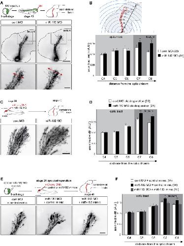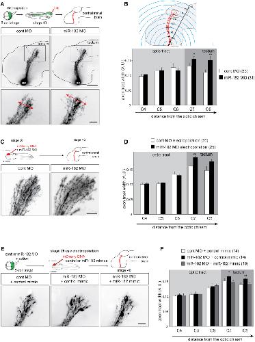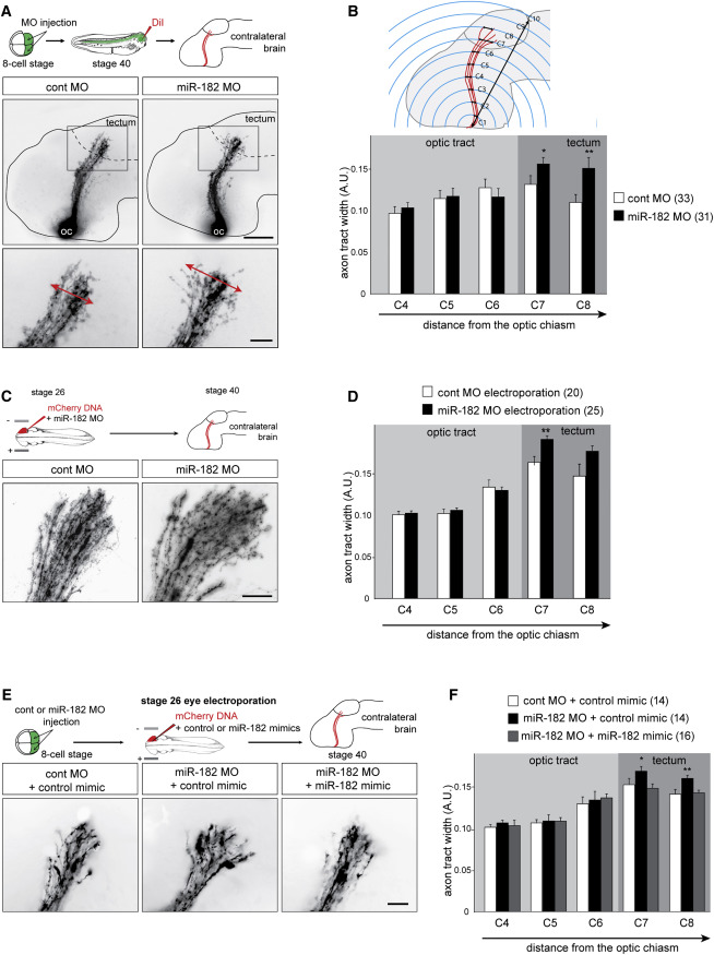 Figure 3. In Vivo, miR-182 Is Involved in RGC Axon Targeting but Not Long-Range Pathfinding (A, C, and E) Schematic representation of the experimental protocols and representative images of brains, where RGC axons are stained with DiI or expressing mCherry. Arrows delineate the width of the pathway (A). (B, D, and F) Quantification of pathway width. (B) Schematic representation of the methodology applied for pathway width measurements. Values are mean ± SEM. Numbers of brains analyzed are between brackets. Two-way ANOVA followed by Bonferroni post-test, âp < 0.05, ââp < 0.01. Cont, control; MO, morpholino oligomer; RGC, retinal ganglion cell. Scale bars, 150 μm (A, top panels) and 50 μm (A, bottom panel; C; and E). See also Figure S3. |