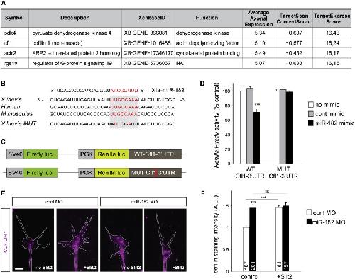 Figure 5. miR-182 Targets Cfl1 mRNA and Regulates Its Expression in RGC Axons (A) Top predicted miR-182 targets expressed in Xenopus laevis growth cones. (B) Sequence alignment of the 3â² UTR of Cfl1. The predicted miR-182 binding site is highlighted in red. (C) Schematic representation of Xenopus Cfl1-3â² UTR, subcloned downstream of a dual Renilla:Firefly luciferase reporter. (D) Quantification of reporter activity in HEK293T cells. (E and F) Representative images (E) and quantification (F) of Cfl1 immunostaining. White lines delineate RGC growth cones. Bath application of Slit2 was used at a suboptimal concentration to avoid collapse. Values are mean ± SEM (D and F). Numbers of GCs analyzed are indicated in bars (F). ANOVA followed by Bonferroni post-test, âââp < 0.001. ns, nonsignificant; cfl1, Cfl1; cont, control; MO, morpholino oligomer; MUT, mutated; WT, wild-type. Scale bar, 5 μm (E). See also Table S2. |