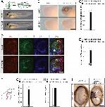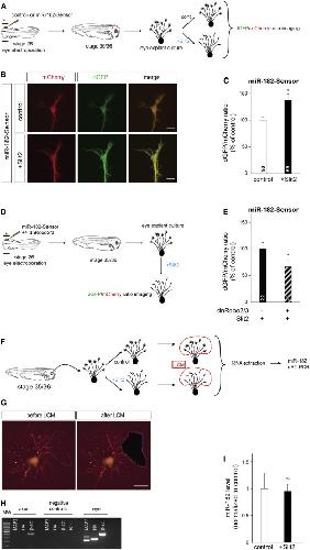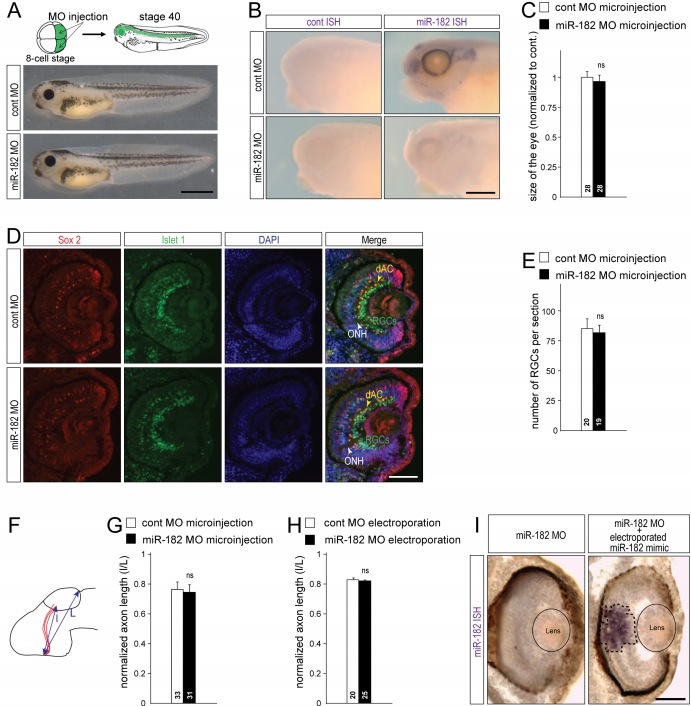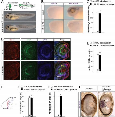 Figure S3: miR-182 MO efficiently knocks down endogenous miR-182 without affecting the generation of RGCs nor the growth of their axons, and miR-182 mimics rescues miR-182 expression, Related to Figure 3. (A-E) Effect of the injection of control or miR-182 MOs in both dorsal blastomeres at eight cell stage embryos, driving the expression of the morpholino in the central nervous system, in Xenopus laevis embryos at stage 37/38 and 40. (A) Schematic of the experimental protocol and representative images of control and miR-182-injected embryos at stage 40. No major difference was observed between controls and miR-182 morphants morphology. (B) Representative images of ISH signal for control or miR-182 probes on stage 37/38 control or miR-182 morphant embryos. Most of the ISH signal for miR-182 in neural cells disappears in presence of miR-182 MOs, suggesting that miR-182 MOs efficiently knockdown endogenous miR-182. (C) Quantification of the size of the eye of control and miR-182 morphant embryos at stage 40 shows no significant differences between the two populations. (D) Representative images of cryosections of the eye of control or miR-182 morphant embryos at stage 40, at the level of the optic nerve head, after immunolabeling for Sox2 (red) and Islet1 (green) and counterstaining with DAPI (blue). (E) Quantification of the number of RGCs, per section, in stage 40 control or miR-182 morphant embryos. No significant difference was observed. (F) Schematic representation of the quantification method after injection in dorsal blastomeres or electroporation in the eye of control or miR-182 MOs, and DiI labeling of the RGC axons. The length of axons was assessed by measuring the distance from the optic chiasm to the longest RGC axons (l) normalized to the size of the brain from the optic chiasm to the posterior boundary of the tectum (L). (G-H) Graph showing the quantification of RGC axon length in control and miR-182 MOs injected (G) or electroporated (H) embryos. No significant difference in RGC axon length was detected in absence of miR-182. (I) Representative images of ISH for miR-182 on vibratome section of stage 37/38 morphant embryos after eye electroporation of control- or miR-182 mimics in the eye. Exogenous miR-182 mimics, but not control mimics, were detected in electroporated retinal areas (delineated by a dashed black line) in a miR-182 morphant background. Through the figure: values are mean ± SEM. Numbers of eye/embryo (C), retinal sections (E) and brains (G, H) analyzed are indicated within bars. All samples passed D’Agostino & Pearson Omnibus normality test. Student’s t-test. ns, nonsignificant Scale bars, 1mm (A), 250µm (B), 100µm (D,I). |