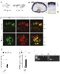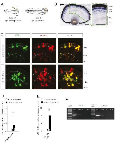 Figure S2: The activity of miR-182-Sensor inversely correlates with the expression of miR-182 in retinal cells, Related to Figure 2. (A) Schematic representation of the experimental protocol. miR-182- or control-Sensor (shown in Fig. 2A) were electroporated in one eye at stage 26. Broken green line indicates the plane of section for the images shown in (B). (B) Representative images of endogenous miR-182 distribution detected by in situ hybridization on stage 40 retinal section. (C) Illustrative images of retina electroporated by control- or miR-182-Sensor. (D-E) Quantification of dGFP / mCherry fluorescence ratio in photoreceptor and amacrine cells following electroporation of control- or miR-182-Sensor. Values are mean ± SEM. Mann Whitney test. ***p< 0.001. ns, nonsignificant. 415 photoreceptor cells and 79 amacrine-like cells (indicated in bars) were analyzed from three retinas per condition in total. (F) Illustrative gel following RT-PCR of dGFP and mCherry mRNAs on electroporated eye, collected at stage 37/38, and RGC axon collected by LCM from stage 40. To avoid detecting the parent plasmid, DNaseI treatment was carried out and RT was performed using oligo(dT). Presence of these two transcripts in axons indicates that Sensor construct is suitable to assess local activity of miR-182 in axons. GCL, ganglion cell layer; INL, inner nuclear layer; IPL, inner plexiform layer; OPL, outer plexiform layer; PRL, photoreceptor layer; RPE, retinal pigmented epithelium; RT-, RT no template negative control; PCR-, PCR no template negative control. Scale bars, 50µm (B), 25µm (C). |