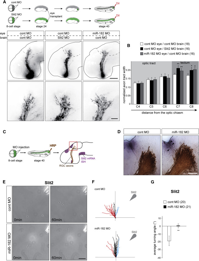 Figure 4. miR-182 Is Involved in Slit2-Driven RGC Axon Guidance and Targeting In Vivo and In Vitro(A) Schematic representation of the experimental protocol and representative images of brains, where RGC axons are stained with DiI.(B) Quantification of pathway width. Numbers of brains analyzed are between brackets.(C and D) Schematic representation of the experimental protocols (C) and representative images (D) of brains, where RGC axons are stained with HRP and Slit2 mRNAs are revealed by ISH.(E–G) In vitro turning assay on stage 35/36 RGC axons cultured for 24 hr and isolated from their cell bodies. (E) Representative images of control of miR-182 morphant RGC GC before and 60 min after being exposed to a gradient of Slit2 established from a pipette (top right corner) set at 45° angle from the initial direction of growth. (F) Tracings of RGC axons are analyzed. The source of the guidance cue is indicated by the arrowhead. Red, black, and blue traces represent, respectively, repulsive behaviors (angle < −5°), nonsignificant changes in the direction of growth (−5° < angle < 5°), and attractive turning (angle > 5°). (G) Quantification of the average turning angle. Numbers of GCs analyzed are between brackets.Values are mean ± SEM (B and G). Two-way ANOVA followed by Bonferroni post-test (B) or Mann-Whitney test (G), ∗p < 0.05, ∗∗p < 0.01. Cont, control; HRP, horseradish peroxidase; ISH, in situ hybridization; MO, morpholino oligomer; RGC, retinal ganglion cell. Scale bars, 150 μm (A, top panels), 50 μm (A, bottom panel, and D), and 30 μm (E). See also Figures S4 and S5. |