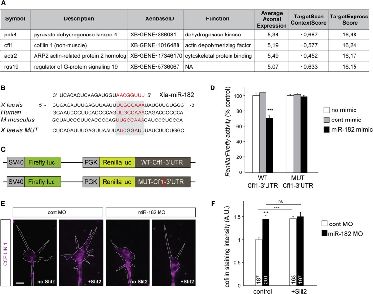 Figure 5. miR-182 Targets Cfl1 mRNA and Regulates Its Expression in RGC Axons(A) Top predicted miR-182 targets expressed in Xenopus laevis growth cones.(B) Sequence alignment of the 3′ UTR of Cfl1. The predicted miR-182 binding site is highlighted in red.(C) Schematic representation of Xenopus Cfl1-3′ UTR, subcloned downstream of a dual Renilla:Firefly luciferase reporter.(D) Quantification of reporter activity in HEK293T cells.(E and F) Representative images (E) and quantification (F) of Cfl1 immunostaining. White lines delineate RGC growth cones. Bath application of Slit2 was used at a suboptimal concentration to avoid collapse.Values are mean ± SEM (D and F). Numbers of GCs analyzed are indicated in bars (F). ANOVA followed by Bonferroni post-test, ∗∗∗p < 0.001. ns, nonsignificant; cfl1, Cfl1; cont, control; MO, morpholino oligomer; MUT, mutated; WT, wild-type. Scale bar, 5 μm (E). See also Table S2. |