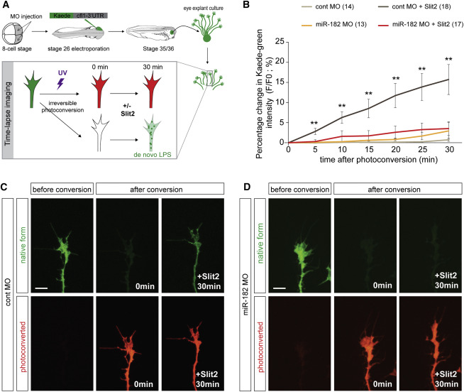 Figure 6. miR-182 Is Required for Slit2-Induced Local Translation of Cfl1 in RGC GCs (A) Schematic representation of the experimental protocol. After 24 hr, RGC axons were isolated from their cell bodies. Bath application of Slit2 at a suboptimal concentration was used to avoid collapse. Vehicle was used as control. Recovery of the newly synthesized Kaede green protein was monitored over time. (B) Quantification of the recovery of Kaede green signal. Data are presented as the percentage change of the fluorescence intensity (F) over time. Numbers of GCs analyzed are indicated in the legend of the graph. (C and D) Representative pre- and post-photoconversion images of severed control (C) or miR-182 morphant (D) axons. Values are mean ± SEM (B). Kruskal-Wallis test, âp < 0.05, ââp < 0.01. Scale bars, 10 μm (C and D). Cont, control; LPS, local protein synthesis; MO, morpholino oligomer. See also Figure S6. |