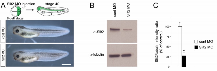 Figure S4: MO-mediated Slit2 knockdown affects the size of the eye, Related to Figure 4. (A) Representative images of stage 40 embryos whose dorsal blastomeres have been injected with control or Slit2 MOs at 8 cell stage. (B-C) The efficiency of Slit2 knockdown was assessed by Western Blot. (B) Representative western blot for Slit2 and α-tubulin of head lysates from stage 40 control or Slit2 morphants. (C) Quantification of Slit2/ α-tubulin intensity ratio (n=3) shows a drastic reduction of Slit2 expression in the presence of Slit2 MO in the nervous system. Values are mean ± SEM. Wilcoxon paired test, **p<0.01. ns, nonsignificant; cont, control; MO, morpholino. Scale bar, 1mm (A). |
