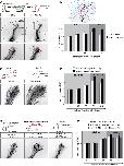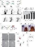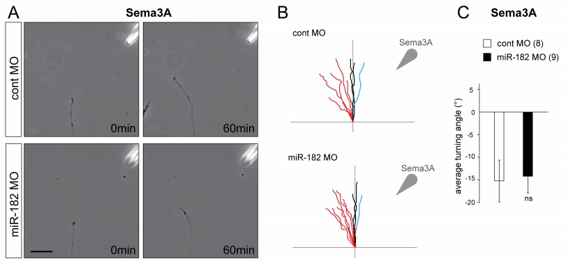 Figure S5: miR-182 is not required for Sema3A-induced repulsive turning of RGC axons in vitro, Related to Figure 4. In vitro turning assay on stage 35/36 RGC axons cultured for 24h and isolated from their cell bodies. (A) Representative images of control or miR-182 morphants RGC GC before and 60 minutes after being exposed to a gradient of Sema3A established from a pipette (top right corner) set at 45° angle from the initial direction of growth. Scale bar, 30µm. (B) Tracings of RGC axons analyzed. Source of guidance cue is indicated by arrowhead. Red, black and blue traces represent, respectively repulsive behaviors (angle <-5°), nonsignificant changes in the direction of growth (-5°<angle<5°), and attractive turning (angle >5°). (C) Quantification of the average turning angle ± SEM. Numbers of GCs analyzed are between brackets. Mann-Whitney test, **p<0.01. ns, nonsignificant. |