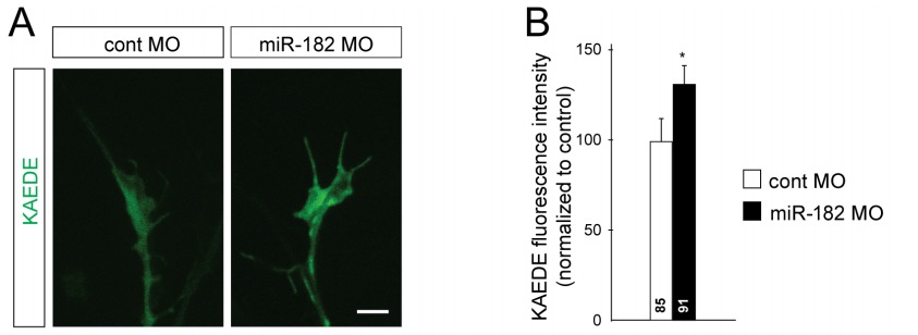 Figure S6: Basal expression level of Kaede-cofilin1 construct in RGC growth cones is regulated by miR-182, Related to Figure 6. Comparison of the basal expression levels of Kaede-cofilin1 in control or miR-182 morphant RGC growth cones in vitro. (A) Representative images of control or miR-182 morphant Kaede-cofilin1 expressing growth cones. Scale bar, 10µm. (B) Quantification of Kaede fluorescent signal in control or miR-182 morphant growth cones. miR-182 knockdown increases the basal expression level of Kaedecofilin1 in RGC growth cones. Values are mean ± SEM. Numbers of growth cones analyzed are indicated within bars. Unpaired Student’s t-test, *p<0.05. |