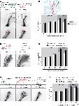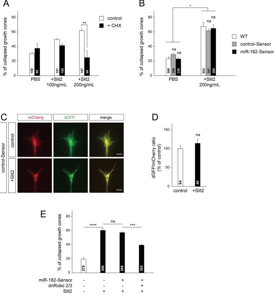 Figure S7: Protein synthesis-dependent Slit2-induced collapse is not affected by the expression of miR-182 activity Sensor, Related to Figure 7. (A) Quantification of collapsed growth cones from stage 35/36 retinal explants cultured for 24h following 10 min 100ng/mL or 200ng/mL Slit2 stimulation by bath application in the presence or absence of the translational blocker cycloheximide (CHX). At 200ng/mL a Slit2-induced PSdependent collapse was observed. (B) Quantification of collapsed growth cones from stage 35/36 retina from wildtype embryos or embryos electroporated at stage 26 with control or miR-182-Sensor (shown in Fig. 2A), cultured for 24h and stimulated for 10 min by 200ng/mL Slit2 or PBS control. (C) Representative images of GCs following retinal electroporation of control-Sensor. (D) Quantification of dGFP / mCherry fluorescent ratio directly at the GC following 10 min Slit2 or PBS control bath application. Mann Whitney Test. (E) Quantification of collapsed growth cones from stage 35/36 retina from wildtype embryos or embryos electroporated at stage 26 with miR-182-Sensor and/or pCS2- dnRobo2-MT and pCS2-dnRobo3-MT, cultured for 24h and stimulated for 10 mins by 200ng/mL Slit2 or PBS control. Collapse was significantly reduced by 18% following electroporation of dnRobo2/3. Residual collapsed growth cones might be due to the fact that not all RGCs are targeted by electroporation. Values are mean ± SEM. Numbers of growth cones analyzed are shown within bars. Two-way ANOVA followed by Sidak multiple comparison test (A,B). *p<0.05; **p<0.01. (B) Not displayed on graph: WT, ****p < 0.0001; control-Sensor, *p<0.05; miR-182-Sensor, **p < 0.01. Oneway ANOVA followed by Sidak multiple comparison post hoc test (E). ***p< 0.001; ****p < 0.0001. ns, nonsignificant. Scale bar, 5µm. |