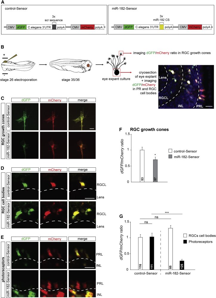 Figure 2. miR-182 Is Active and Enriched in RGC Axons (A) Sensor construct design. (B) Schematic representation of the experimental protocol. (CâE) Illustrative images of RGC GCs (C), RGC soma (D), or PRs (E) following retinal electroporation of control-Sensor or miR-182-Sensor. Clear examples of dGFP/mCherry ratio decrease are shown in (C) and (E). (F and G) Quantification of the dGFP/mCherry ratio at the RGC GCs, soma, or PRs. Values are mean ± SEM. Mann-Whitney test (F) and two-way ANOVA followed by Tukey post hoc test (G), âp < 0.05, ââââp < 0.0001. ns, nonsignificant; CMV, cytomegalovirus promoter; CS, complementary sequence; dGFP, destabilized GFP; INL, inner nuclear layer; PRL, photoreceptor layer; RGCL, retinal ganglion cell layer. Scale bars, 20 μm (B, D, and E) and 5 μm (C). See also Figure S2. |