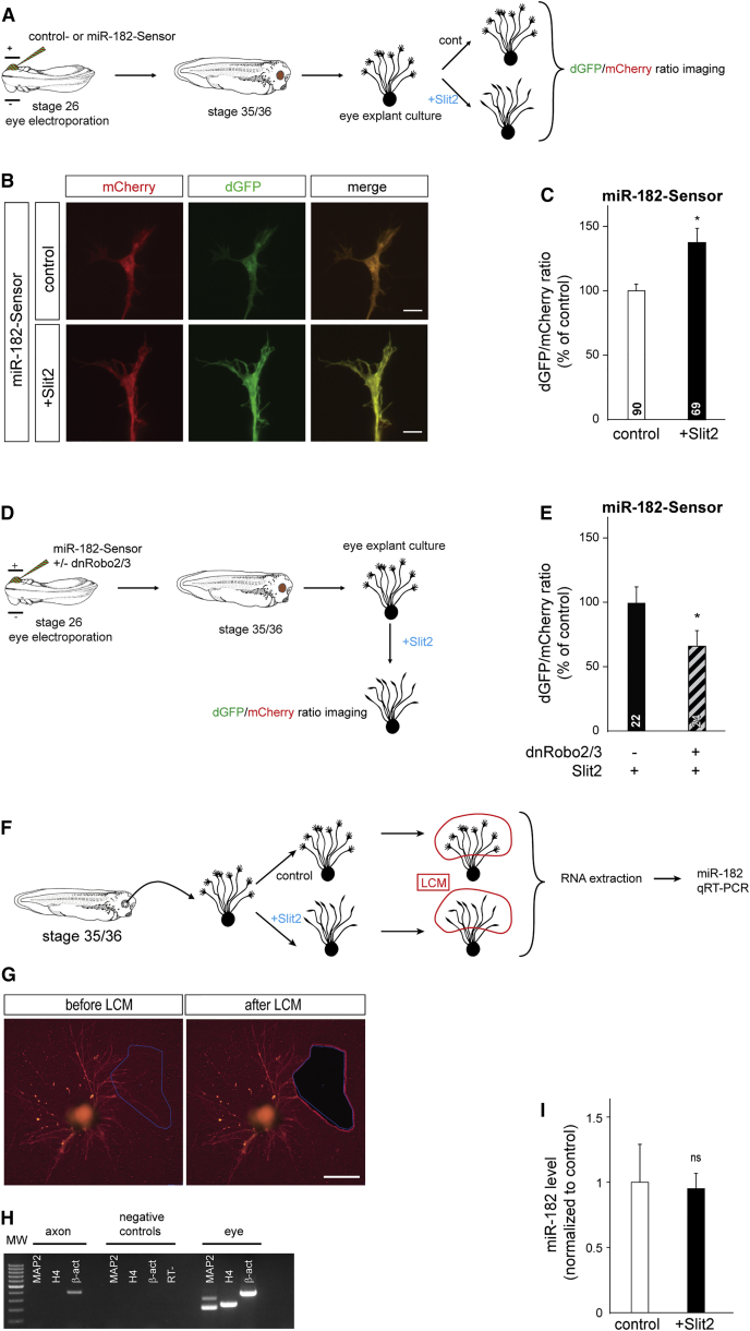 Figure 7. Slit2 Inhibits miR-182 Activity in RGC Axons without Decay (A, D, and F) Schematic representation of the experimental paradigm. Stage 35/36 retinal explants were cultured for 24 hr, and then Slit2 or vehicle were bath applied for 10 min. (B) Illustrative images of GCs from miR-182-Sensor-electroporated RGCs grown in culture. A clear example of dGFP/mCherry ratio increase is shown in (B). (C and E) Quantification of the dGFP/mCherry fluorescent ratio at the GC. (G) Illustrative images of explants and axons before and after LCM. (H) Illustrative gel of RT-PCR reaction for β-actin (β-act), MAP2, and histone H4 (H4) mRNA from cultured axons collected from stage 37/38 by LCM. In MAP2, H4, and β-act negative controls, PCR template was omitted. (I) Quantification of miR-182 by the δδCt method in LCM axons. Values are mean ± SEM (C, E, and I). Mann-Whitney test, âp < 0.05. ns, nonsignificant; LCM, laser capture microdissection; RTâ, RT no template negative control. Scale bars, 5 μm (B) and 200 μm (G). See also Figure S7. |
