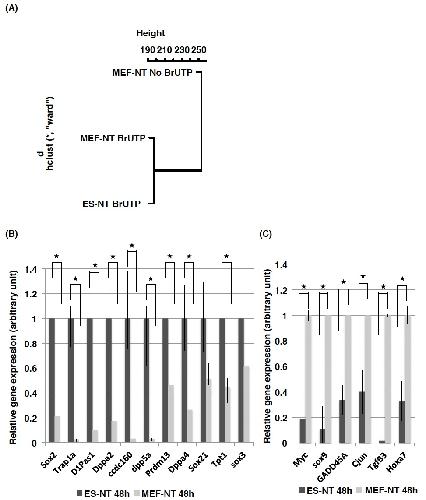 Supplemental Figure S1 related to Figure 1. Identification of resistant genes by RNA-seq analysis of BrUTP labelled RNA 48h after nuclear transfer. (A) hierarchical clustering of RNA-seq data obtained from samples obtained with (MEF-NT and ES-NT BrUTP)or without BrUTP labelling (MEF-NT No BrUTP) . (B)(C) RT-qPCR analysis of genes identified as resistant in MEF (B) or ES (C). Mean +/- sem from n=3 experiments. (★, P value< 0.05, student t-test). |