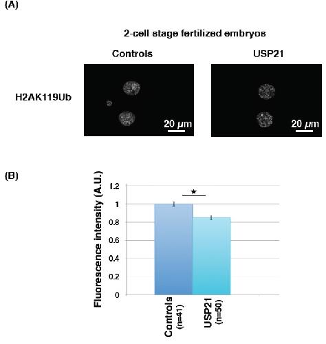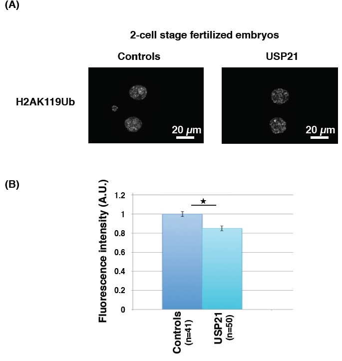 Supplemental Figure S5 related to Figure 6:USP21 mRNA injection decreases H2AK119u1 level in mouse 2-cell embryos. (A) H2AK119u1 in the nuclei of control or USP21 injected embryos. Embryos are injected at fertilization with mRNA encoding USP21 and subsequently fixed for immunolabelling at the 2-cell stage. (B) Quantitation of H2AK119u1 signal intensity in control and USP21 injected 2-cell stage embryos. Number of embryos quantitated shown in bracket. ('star', P value< 0.001, Mann-Whitney test). |