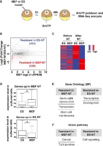 Figure1. Identification of Genes Resisting Transcriptional Reprogramming by Oocytes(A) Schematic representation shows the nuclear transplantation strategy used to identify genes resistant to reactivation by Xenopus oocytes.(B) MA plot shows log fold change (logFC, y axis) in gene expression between MEF-NT versus ES-NT against the expression in cultured MEFs (x axis, log2 reads per kilobase per million mapped reads [RPKM]; data from Reddington etal., 2013). Red and blue dots, genes differentially expressed (FDR< 0.05, two experiments, n= 32 NT samples per condition).(C) Heatmap representing expression of the differentially expressed genes (rows, Z score of normalized expression level) between MEF-NT and ES-NT in ES and MEF before and 48hr after NT (columns, genes sorted according to fold change between MEF-NT to ES-NT). Expression data for cells before NT are from Reddington etal. (2013) and Bulut-Karslioglu etal. (2014).(D) Boxplot shows the gene expression level before and after NT of genes resistant in MEF-NT (538 genes,top) or resistant in ES-NT (424 genes, bottom). [star] pvalue< 106, Wicoxon rank-sum test.(E and F) The top (E) gene ontology terms and (F)KEGG pathways enriched in the list of differentially expressed (DE) genes restricted in MEF-NT and ES-NT. See also FigureS1 and Tables S1 and S2. |