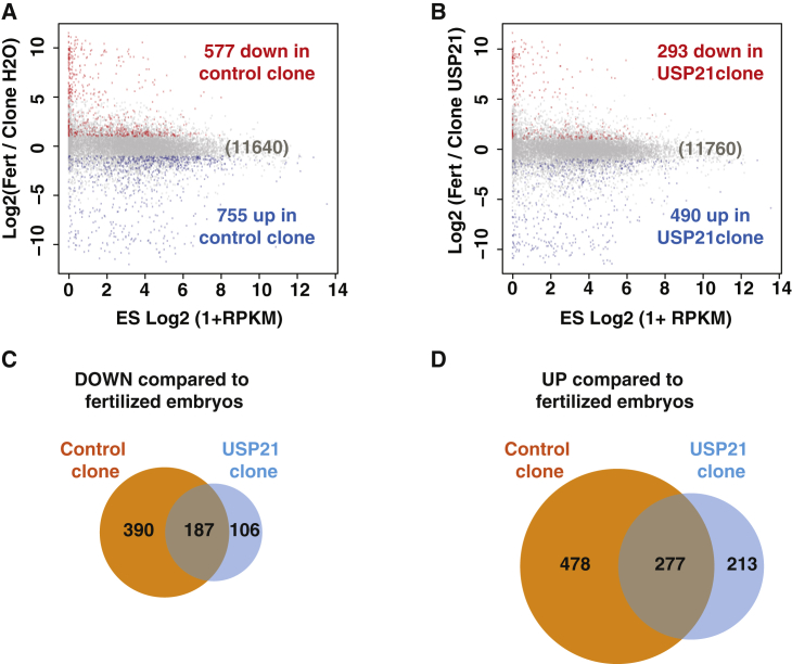 Figure 6. USP21 Improves Transcriptional Reprogramming of Two-Cell-Stage Cloned Mouse Embryos(A) MA plot showing log fold change in gene expression between fertilized embryos and ES clone embryos (logFC, y axis) against the log of gene expression in cultured ES (logCPM, x axis). Differentially expressed genes are shown in red and blue for genes downregulated and upregulated in clones compared to fertilized embryos, respectively (FDR < 0.05, three experiments).(B) Same as (A) except that USP21 was overexpressed in the cloned embryos.(C and D) Venn diagram indicating the overlap between the downregulated genes (C) and upregulated genes (D) in control and USP21 clones. See also Figure S5 and Tables S6 and S7. |