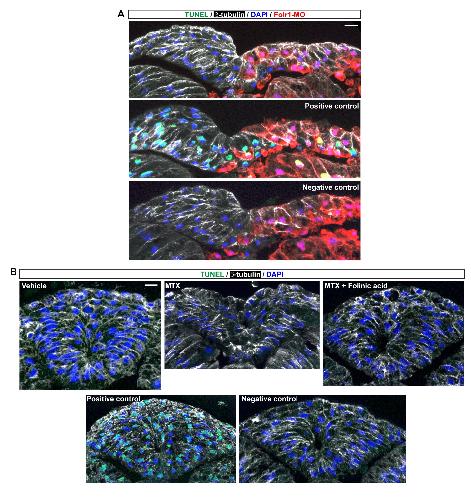 Fig. S2. Folr1-MO or methotrexate does not induce apoptosis of neural plate cells during neurulation. (A) Two-cell-stage embryos were unilaterally injected with 10 pmol folate receptor 1 morpholino (Folr1-MO) and Alexa 594-conjugated dextran and grown until neural plate stage 17 (18.75 hpf). (B) Early neural plate stage embryos (stage 13, 14.75 hpf) were incubated in the absence (Control) or presence of 1-1.5 mM methotrexate (MTX) until closure of the neural tube in controls (stage 20, 21.75 hpf). (A,B) Embryos were then processed for TUNEL assay, immunostaining for β-tubulin and nuclear labeling with DAPI. Shown are representative transverse sections of neural tissue from aforementioned embryos. Positive control is a sample treated with DNase; negative control is a sample in which no labeling enzyme (Terminal Deoxynuclotidyl Transferase) was added. Scale bars: 20 μm. |