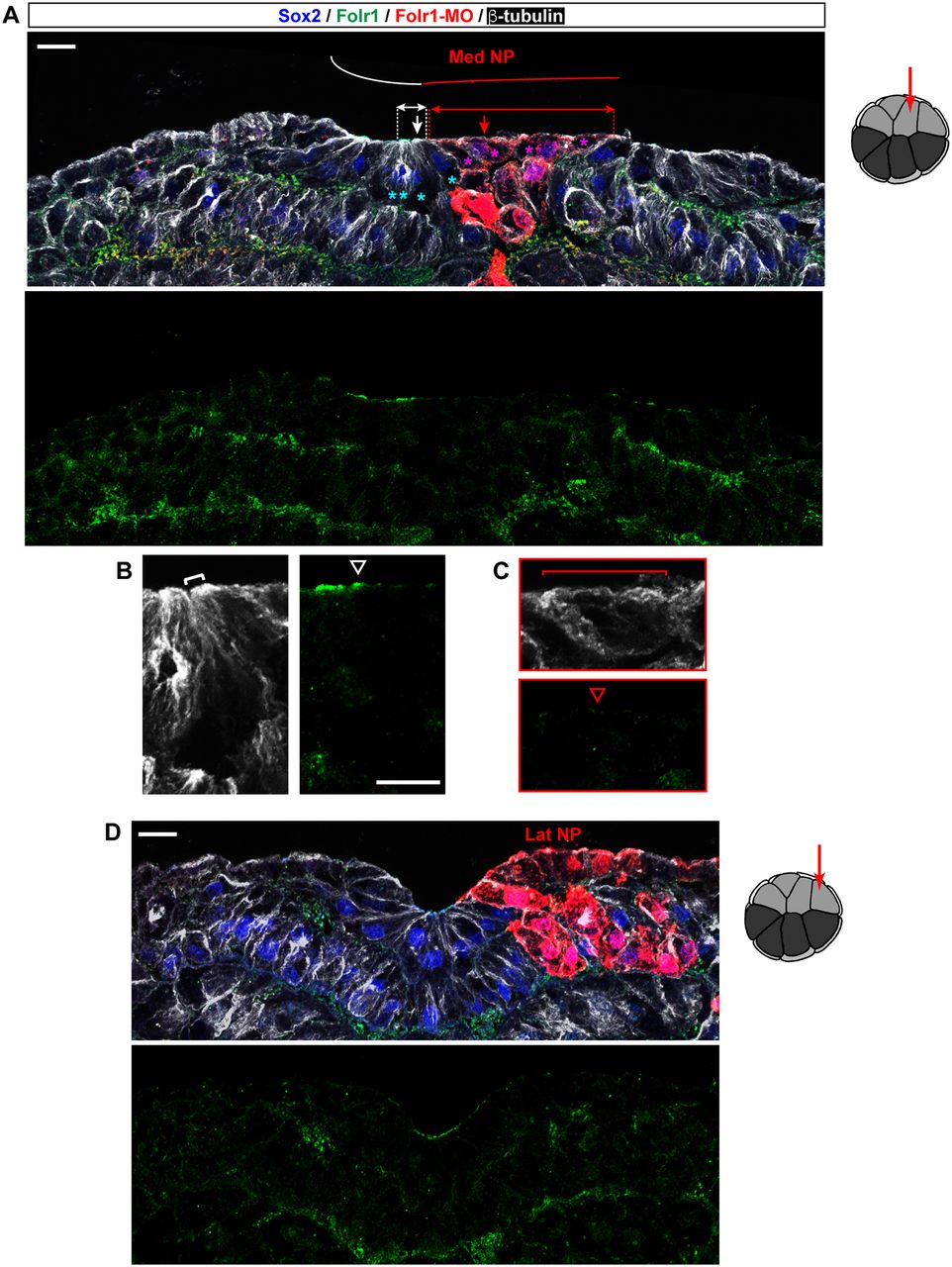 Fig. 4. Folate receptor 1 in medial neural plate cells is necessary for changes in cell morphology required for neural plate folding. (A-D) Representative examples of neurulating embryos unilaterally microinjected at the 16-cell stage with 1.8â pmol Folr1-MO along with GFP mRNA in the dorsal medial (A-C) or dorsal lateral (D) animal blastomeres, as indicated in drawings on the right, sectioned and processed for Sox2, neural progenitor marker (blue), Folr1 (green), GFP (red) and β-tubulin (white) immunostaining. Red indicates Folr1-MO-containing cells. (A) Folr1 knockdown in medial neural plate (Med NP) cells impedes neural plate folding. Asterisks indicate same number of medial cells in wild-type (blue) and Folr1-deficient (pink) sides of the neural plate counted from the midline to represent the impact on the extent of the medial apical surface (white and red double arrows). Curves indicate the bending of the neural plate in wild-type (white) and Folr1-deficient (red) tissues. Arrows in A indicate cells shown in B (white, wild type) and C (red, Folr1 deficient). (B) Wild-type apically constricted (bracket) cell (second from the midline) from the superficial layer of the medial neural plate. Arrowhead indicates apically localized Folr1. (C) Cell (second from the midline) from the superficial layer of the Folr1-deficient side (red) of the medial neural plate fails to constrict (bracket). Arrowhead indicates lack of apically localized Folr1. (D) Folr1 knockdown in lateral neural plate (Lat NP) cells does not induce any apparent morphogenic phenotype. Scale bars: 20â µm. |