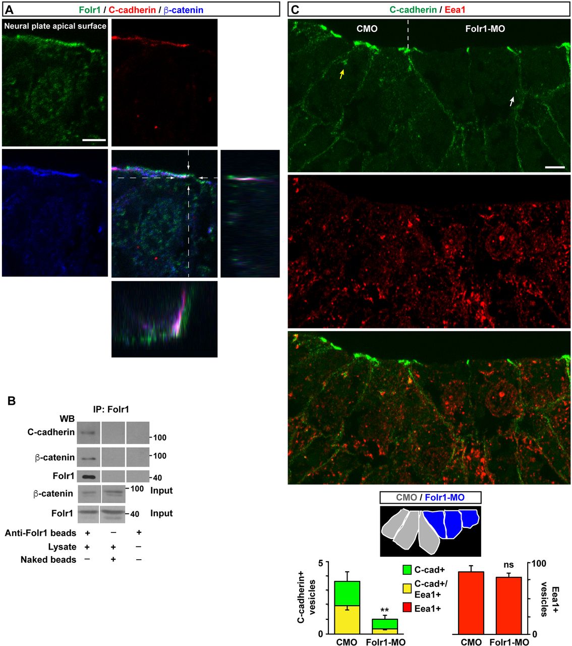 Fig. 6. Folate receptor interacts with C-cadherin and is necessary for its endocytosis in medial neural plate cells during neural plate folding. (A) Neural plate stage embryos were processed for Folr1 (green), C-cadherin (red) and β-catenin (blue) immunostaining. Shown is a representative transverse single z-section of immunostained stage 15 medial neural plate cell with orthogonal view through the indicated planes to demonstrate partial apical colocalization of Folr1, C-cadherin and β-catenin in the neural plate. Scale bar: 5â µm. (B) C-cadherin and β-catenin co-immunoprecipitate with Folr1. Lysates from wild-type neural plate stage embryos were incubated with anti-Folr1-crosslinked beads or naked beads. Co-immunoprecipitated proteins were dissociated from beads and run in SDS-PAGE gels for western blot assays with anti-Folr1, C-cadherin and β-catenin antibodies. Shown are representative western blot assays, which were performed five times with similar results. (C) The number of C-cadherin-containing vesicles including C-cadherin-containing early endosomes is reduced in Folr1-deficient medial neural plate cells. Two-cell-stage embryos were unilaterally microinjected with CMO and Folr1-MO in contralateral blastomeres. Shown is a representative example of transverse section from a neurulating embryo immunostained for C-cadherin (green) and Eea1 (red). Schematic indicates the cells from which the number of immunopositive vesicles were counted. Yellow arrow points to a C-cadherin+/Eea1+ vesicle and white arrow points to a C-cadherin+/ Eea1â vesicle. Scale bar: 10â µm. Graph shows mean±s.e.m. C-cadherin- and EEA1-labeled vesicles/cell measured in 54 CMO- and 54 Folr1-MO-containing medial neural plate cells in 18 sections from five embryos; **P<0.005; paired Student's t-test. |