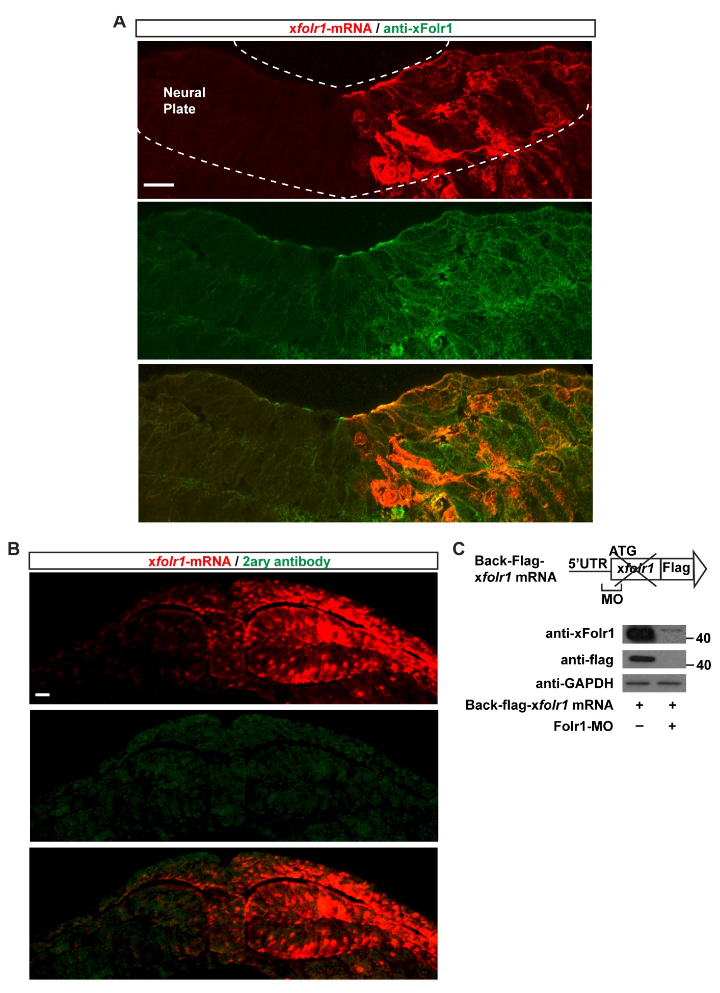 Fig. S1. Specificity of Xenopus folate receptor 1 antibody. (A,B) Two-cell-stage embryos were unilaterally injected with 700 pg xfolr1 mRNA+GFP mRNA (A) or Alexa Fluor 594-dextran conjugate (B), paraffin-sectioned and processed for xFolr1 immunostaining with (A) or without (B) Folr1 primary antibody added. Scale bar: 20 μm. (C) Schematic of construct to demonstrate specificity of xFolr1 antibody and representative Western blot from whole cell homogenates from embryos injected at the 2- cell stage with the indicated constructs. xFolr1: Xenopus laevis folate receptor 1, Folr1- MO: xFolr1-targeted translation blocking-morpholino. |