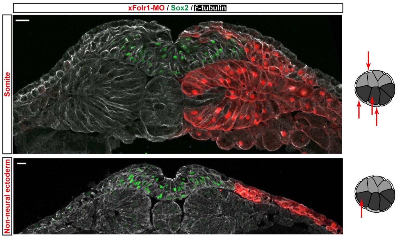 Fig. S3. Knockdown of folate receptor 1 in mesoderm or non-neural ectoderm does not induce neural tube defects. Targeted blastomeres of 16-cell-stage embryos were unilaterally microinjected with 3 pmol/cell morpholino against the Xenopus laevis Folr1 (Folr1-MO) along with Alexa 594-dextran conjugate in indicated blastomeres (left). Neural plate stage embryos were then sectioned and processed for immunostaining with anti-β-tubulin (grayscale) and Sox2 (green). Red indicates MO-containing cells. Scale bars: 20 μm. |