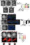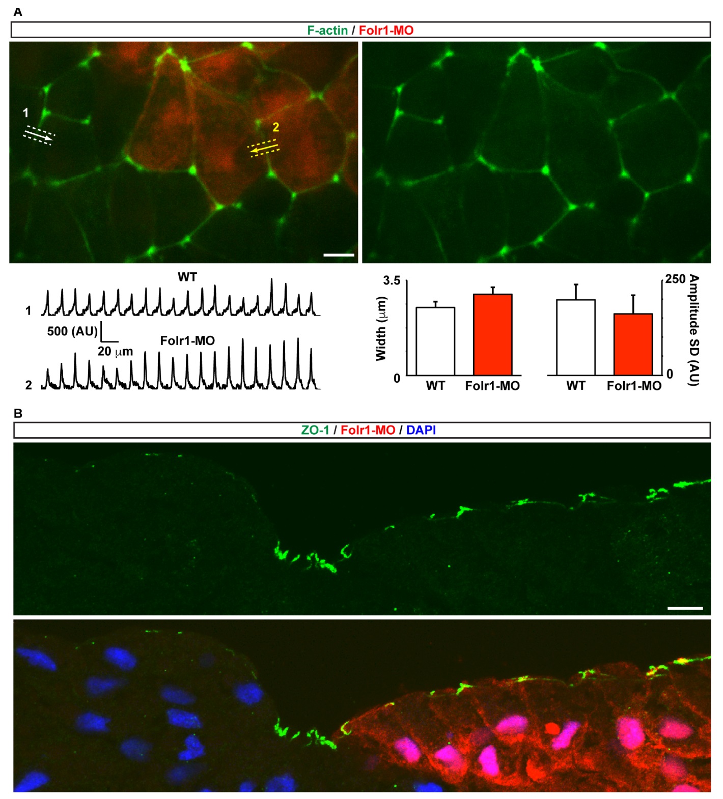 Fig. S4. Folr1 knockdown does not induce changes in actin dynamics or in overall apicobasal polarity in the folding neural plate. (A) Two-cell-stage embryos were unilaterally microinjected with Folr1-MO along with Alexa Fluor 594-dextran conjugate (red) and bilaterally injected with mCherry-UtropinCH (F-actin reporter, green). Superficial medial neural plate was time-lapse imaged from whole embryos at a rate of 1- 2 min−1. Fluorescence intensity profiles (arrows) across cell-cell borders were measured among wild-type (WT, 1) and Folr1-MO (2) containing cells during 15 min imaging. Scale bar, 10 μm. Intensity profiles were fitted with Gauss function using R software after background substraction. Bar graph shows mean±SEM peak width at 50% maximum intensity (left) and standard deviation (SD) of normalized maximum intensity during 15 min recording (right), n: 28 cell-cell borders per group, t-test. (B) Unilateral Folr1-MO-containing neural plate stage embryos were sectioned and processed for immunostaining with anti-ZO-1 (green). Scale bar, 20 μm. |