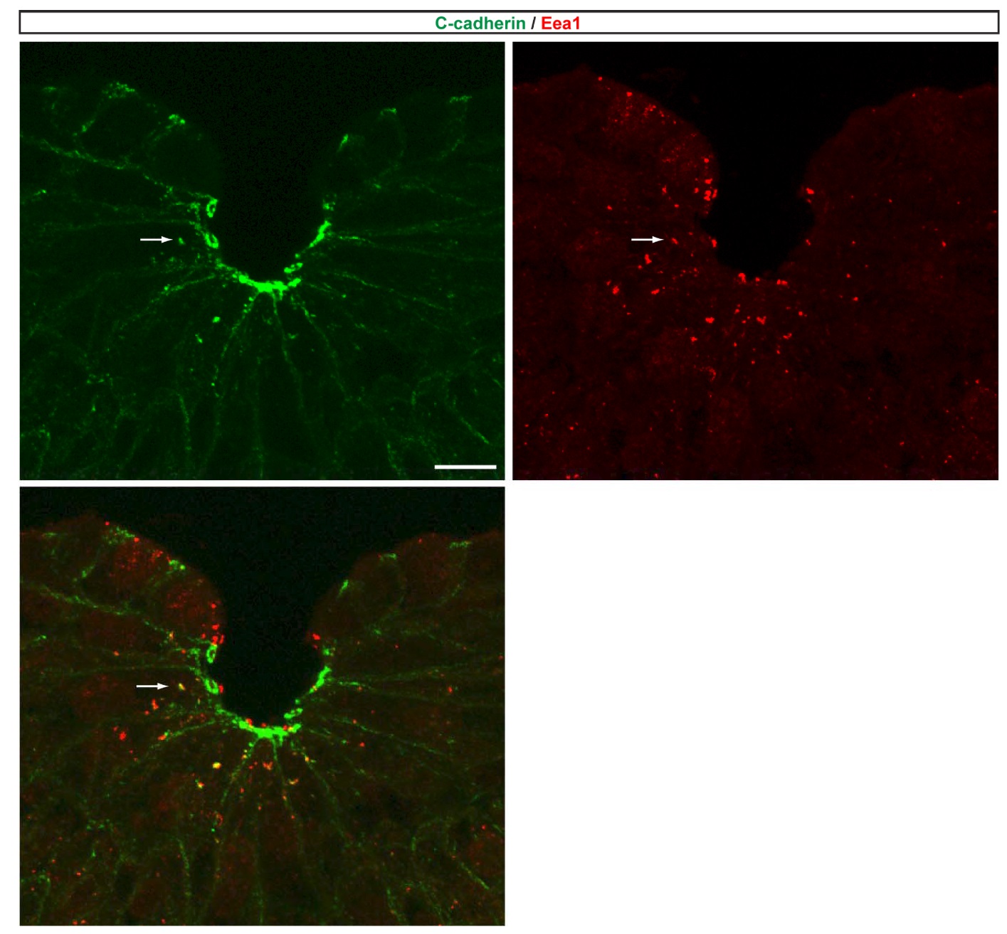 Fig. S5. Neural plate cell apical constriction is concurrent with endocytosis of Ccadherin. Neural plate stage embryos were sectioned and processed for immunostaining with anti-C-cadherin (green) and anti-Eea1 (red). Scale bar, 20 μm. Arrow points to a Ccadherin- containing endosome. |