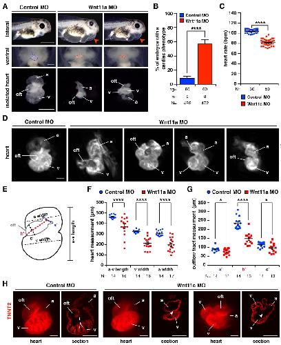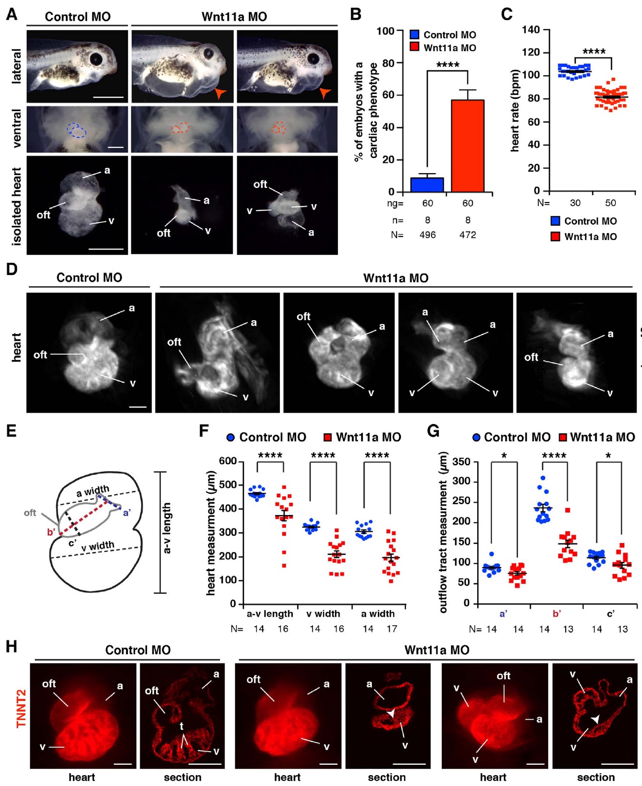 Fig. 1. : Depletion of Wnt11a disrupts cardiogenesis in Xenopus laevis. A. Wnt11a MO injection leads to a cardiac phenotype characterized by cardiac edema (lateral view, red arrowheads) and smaller, deformed hearts (ventral view, dotted lines; isolated hearts) at stage 43. Scale bars: lateral view: 1000 μm; ventral view and isolated hearts: 250 μm. B. Quantitative presentation of the data shown in A. C. The heart rate is significantly reduced in Wnt11a-depleted embryos. D-G. Analysis of cardiac Troponin T stained Wnt11a morphant hearts using OPT. Atrial width, ventricular width and a-v length were measured as indicated in E resulting in data provided in F. Measurement of the OFT was done as indicated in E. Data are given in G. Scale bar: 100 μm. H. Cardiac Troponin T (Tnnt2) staining shows that Wnt11a inhibition results in smaller and malformed hearts. Cross sections demonstrate a disturbed ventricular trabeculation (t). Scale bars: 100 μm. White arrowheads indicate disturbed trabeculation. a, atrium; bpm, beats per minute; n, number of independent experiments; N, number of analysed embryos; ng, nanogram; oft, outflow tract; v, ventricle. Error bars indicate standard error of the means (s.e.m.). *, pâ¤0.05; ****, pâ¤0.0001; calculated by a non-parametric Mann-Whitney rank sum test. |