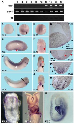 Fig. 2. : Expression of rcsd1 during embryogenesis. A. Temporal expression of rcsd1 at different stages of Xenopus development. Gapdh was used as loading control. Negative controls (-RT) were performed without reverse transcriptase (RT). Rcsd1 is weakly expressed maternally. Zygotic rcsd1 expression starts at stage 13. B-N. Spatial expression of rcsd1 at different developmental stages as indicated in Xenopus. Rcsd1 expression is first detected in the common cardiac progenitor at stage 20 (black arrowhead). Cardiac expression persists until later stages (black arrowheads). In addition, rcsd1 transcripts were detected in the somites (white arrowheads) and myeloid cells (red arrowheads). KN. Cross section through the cardiogenic region of Xenopus embryos as indicated by the black dashed lines in C, E, G and I, respectively. Expression in cardiac tissue is detected at stage 20 (K, sagittal section), 24 (L, transversal section), 30 (M, transversal section)