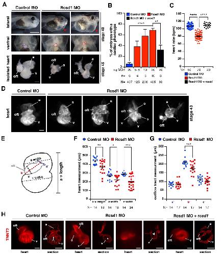 Fig. 7. : Cardiac phenotype after loss of Rcsd1 and after rescue with murine Rcsd1 constructs. A. Cardiac phenotype after Rcsd1 depletion and after rescue with murine Rcsd1 constructs at stage 43. The three upper rows show embryos from lateral and ventral view and the respective isolated hearts. The three lower rows show analysed ventricular trabeculation by cardiac Troponin T (Tnnt2) staining. Rows top to bottom: ventral view of the embryos, close-up of the respective hearts and section through the hearts cardiac phenotype after loss of Rcsd1 was rescued by co-injection with the full-length murine Rcsd1 construct and Rcsd1δNLS, although ventricular trabeculation was only partially restored to normal physical appearances. Rcsd1δCPI however was not able to restore cardiac anatomy and physiology. a, atrium; oft, outflow tract; t, trabeculae; v, ventricle, NLS: nuclear localization signal. (Lateral view: red arrowhead highlights cardiac edema upon loss of Rscd1. White arrow heads highlight the cardiac region in embryos of different rescue experiments. Scale bars: upper part: lateral view: 1000 μm; ventral view and isolated hearts: 250 μm; lower part Tnnt2: ventral view: 1000 μm; hearts and sections: 100 μm. B. Quantitative presentation of data shown in A. C. Injection of Rcsd1 MO lead to a reduced heart rate (beats per minute, bpm), which is rescued by co-injecting murine full-length Rcsd1 or Rcsd1δNLS mRNA but not by Rcsd1δCPI mRNA. n, number of independent experiments; N, number of analysed embryos; ng, nanogram. Error bars indicate standard error of the means (s.e.m.). n.s., not significant; **, pâ¤0.01; ****, pâ¤0.0001; calculated by a non-parametric Mann-Whitney rank sum test. |