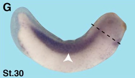 rcsd1 (RCSD domain containing 1) gene expression in Xenopus laevis embryo, assayed via in situ hybridization, NF stage 30, lateral view, anterior right, dorsal up. |