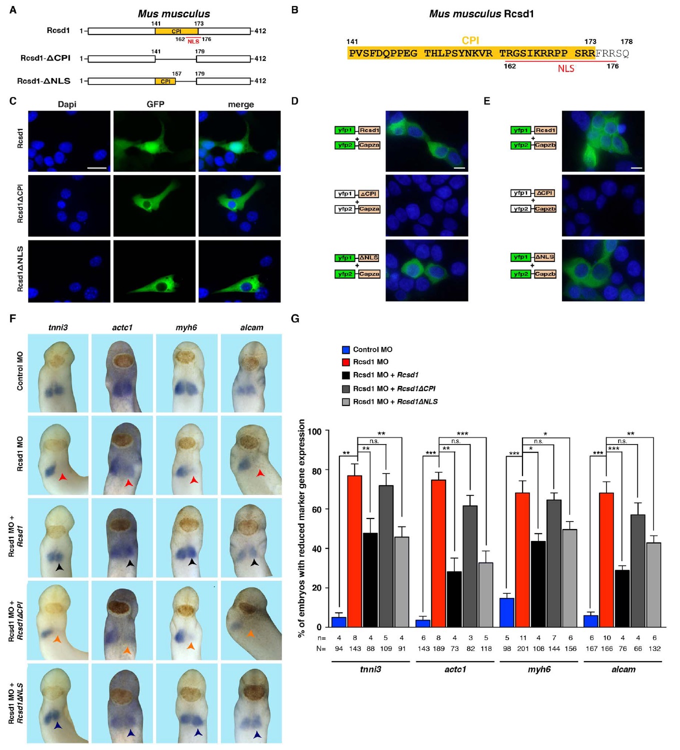 Fig. 6. : Rcsd1 functionally interacts with CapZ in the cytosol. A. Schematic overview of used murine Rcsd1 and deletion constructs. Rcsd1 contains a CPI (capping protein interaction) and a NLS (nuclear localization signal) motif. Numbers indicate amino acids in the Rcsd1 protein. B. Amino acid sequence of murine CPI and NLS motifs. Numbers indicate amino acids in the Rcsd1 protein. C. Transfection of the full-length EGFP-Rcsd1 fusion construct revealed that Rcsd1 is localized in the nucleus and cytosol (upper row). Deletion of CPI (middle row) or NLS (lower row) in Rcsd1 leads to a cytosolic localization. Scale bar: 100 μm. D-E. Split YFP complementation assays. Murine full-length Rcsd1 and Rcsd1δNLS (labelled as δNLS) interact with CapZa and CapZb whereas Rcsd1δCPI (labelled as δCPI) does not. Scale bars D, E: 10 μm. F. Rcsd1 MO was unilaterally injected along with different murine Rcsd1 constructs and the expression of the cardiac markers tnni3, actc1, myh6 and alcam was monitored at stage 28 (ventral views). Reduced marker gene expression upon loss of Rcsd1 (red arrowheads) was rescued by co-injection with the full-length murine Rcsd1 construct (Rcsd1, dark grey arrowheads) and Rcsd1δNLS (dark blue arrowheads). Rcsd1δCPI however (orange arrowheads) was not able to restore marker gene expression. G. Quantitative presentation of data shown in F. n, number of independent experiments; N, number of analysed embryos. Error bars indicate standard error of the means (s.e.m.). n.s., not significant, *, pâ¤0.05; **, pâ¤0.01; ***, pâ¤0.001; calculated by a non-parametric Mann-Whitney rank sum test. |