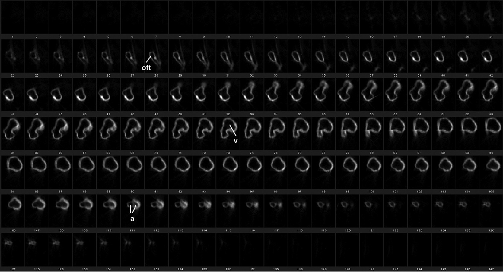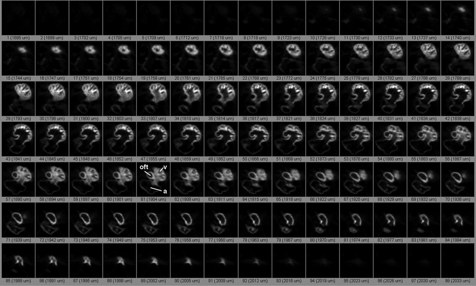 Serial sections through a heart of a Control MO injected embryo derived from OPT image stacks. a, atrium; oft, outflow tract; v, ventricle. |