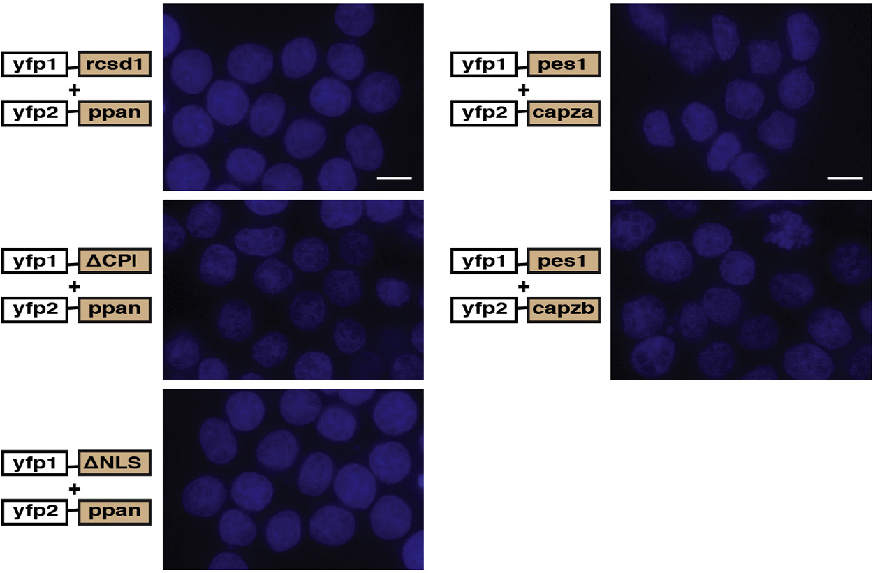 Negative controls for the YFP interaction assay. HEK293 cells were transiently transfected with the different murine Rcsd1 and CapZ constructs used in Fig. 6 together with unrelated genes for negative controls. Neither CapZ (CapZa and CapZb) do interact with Xenopus Pes1 nor the full length or different deletion constructs of Rcsd1 with Xenopus Ppan.