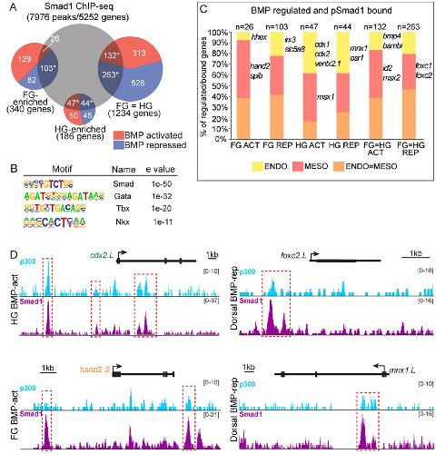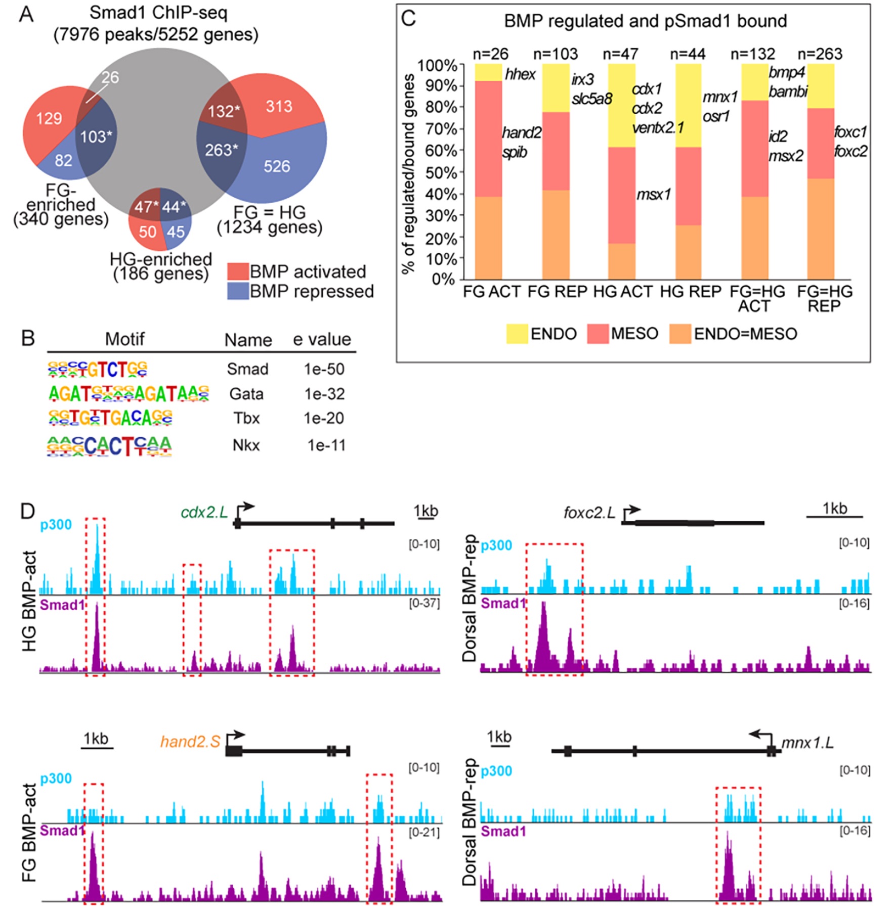Fig. 3. Smad1 chromatin binding to BMP-regulated genes. (A) Smad1 ChIP-seq analysis of NF20 whole embryos identified 7976 peaks within 20â kb (upstream or downstream) of 5252 genes. The Venn diagram intersecting 5252 Smad1-bound genes with the 1760 BMP-regulated genes (from Fig. 2B) grouped as FG enriched (n=340), HG enriched (n=186) or as being expressed at similar levels in the FG and HG (FG=HG; n=1234), identifies 615 BMP-regulated genes associated with Smad1 binding. BMP-activated genes are in red and BMP-repressed genes in blue.*P<0.05, hypergeometric test. (B) DNA-binding protein motif enrichment analysis of 7976 Smad1 peaks. (C) Chart illustrates Smad1-bound genes within the different categories of BMP-activated (ACT) and BMP-repressed (REP) genes. (D) Genome browser view of Smad1 peaks on BMP-activated HG gene cdx2 and ventral mesoderm gene hand2, as well as BMP-repressed dorsal genes foxc2 and mnx1. Red boxes indicate statistically significant Smad1 peaks. |