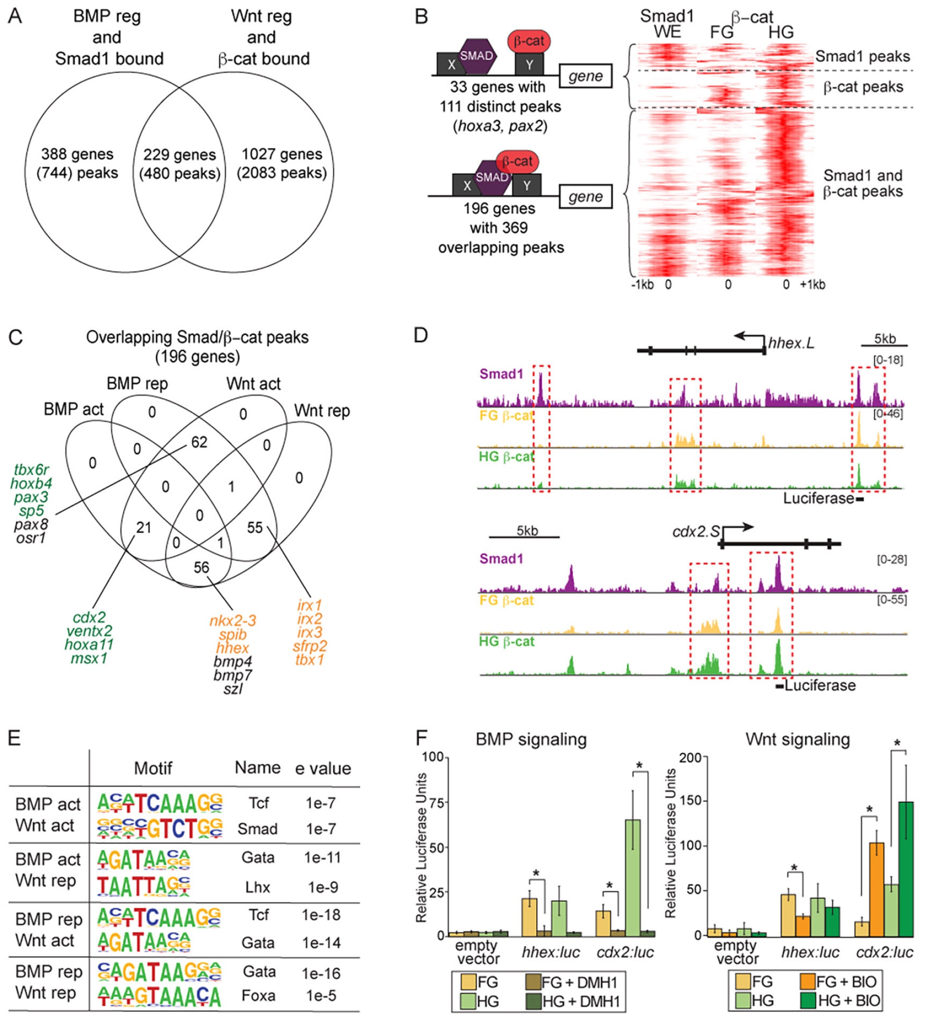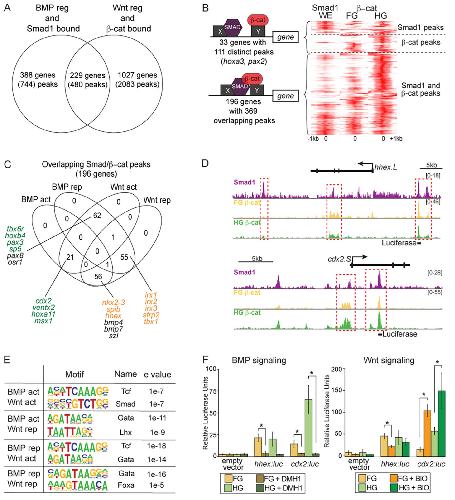 Fig. 6. Smad1 and β-catenin converge on common CRMs. (A) Overlap of BMP-regulated/Smad1-bound genes with Wnt-regulated/β-catenin-bound genes. (B) Schematic of 33 genes with distinct β-catenin and Smad1 peaks and of 196 genes with overlapping β-catenin and Smad1 peaks. Right panel shows Smad1 and β-catenin read density in the corresponding peaks. WE, whole embryo. (C) Venn diagram showing the 196 genes with overlapping Smad1 and β-catenin peaks categorized based on activation (act) or repression (rep) by BMP and Wnt signaling. FG genes are in yellow and HG genes are in green. (D) Genome browser view of β-catenin and Smad1 peaks on hhex and cdx2 with illustration of CRMs tested in luciferase constructs. Red boxes indicate overlapping Smad1 and β-catenin peaks. (E) Motif enrichment analysis of gene sets based on BMP/Wnt regulation. (F) Luciferase assays of reporter constructs with CRMs depicted in D. FG cells were injected in the C1 blastomere and HG cells in the C4 blastomere of 32-cell stage embryos. Error bars represent s.d. of three biological replicates. *P<0.05, Student's t-test. |
