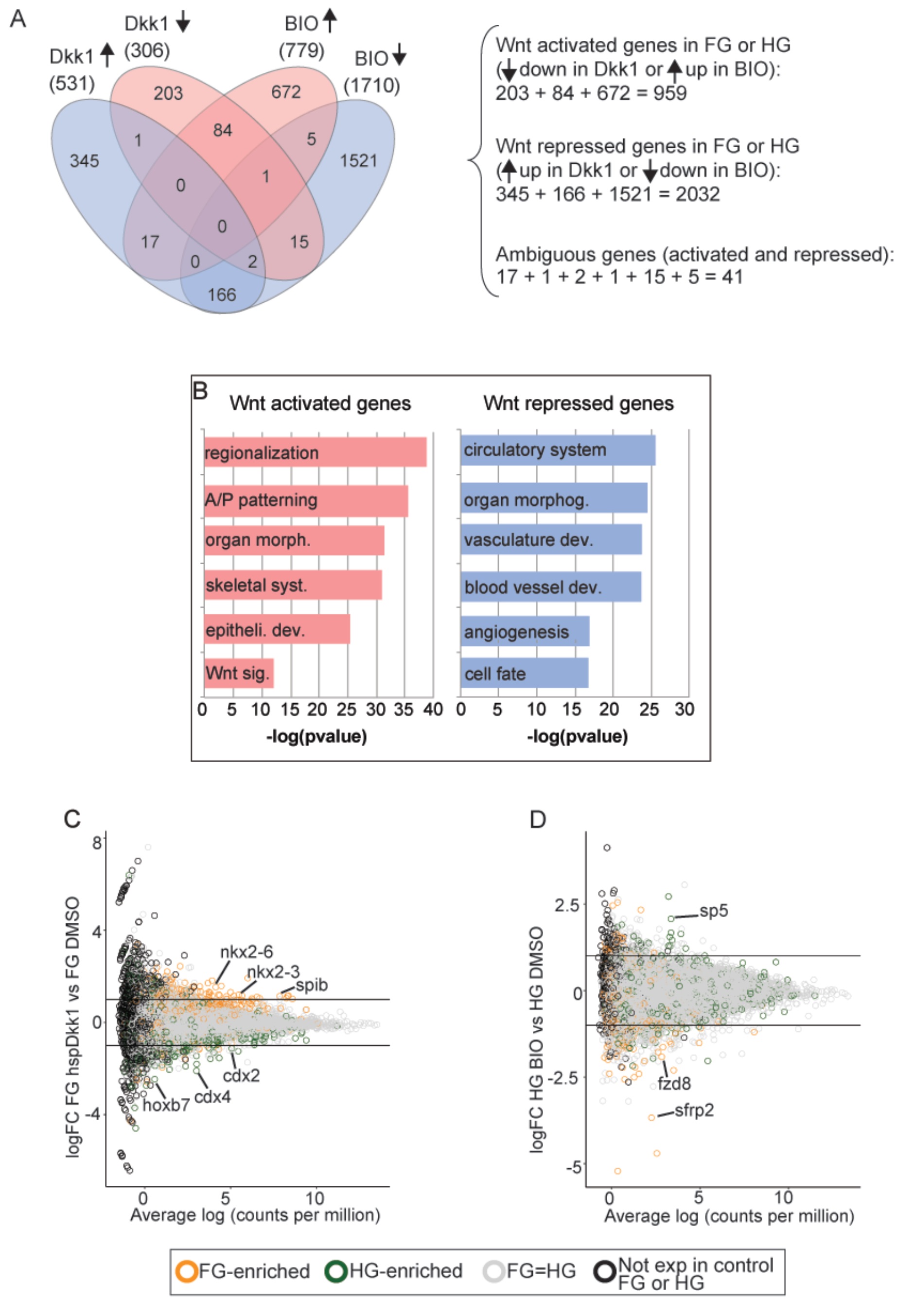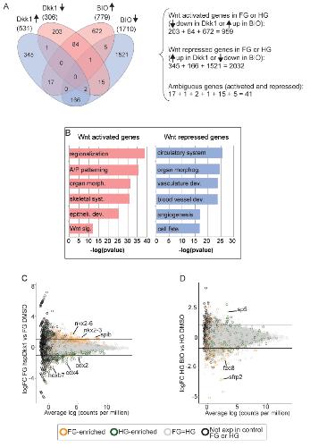 Fig. S4: RNA-seq of control, Tg(hsp70:dkk1) and BIO treated embryos. (A) Venn diagram illustrates transcripts with expression increased (é) or decreased (ê) upon Tg(hsp70:dkk1) or BIO treatment in FG or HG tissues. Wnt-activated genes were log2FC ≤-1 upon heatshock or log2FC ≥1 upon BIO treatment FDR ≤5% (n=959). Wnt-repressed genes were log2FC ≥1 upon heat-shock or log2FC ≤-1 upon BIO treatment FDR ≤5% (n=2032). Forty-one transcripts had ambiguous regulation with evidence of being both Wnt-activated and Wnt-repressed, and were excluded from further analysis. Overall we categorized a total of 2991 (959+2032) Wnt-regulated genes in the FG and HG tissue. (B) GO term enrichment analysis of Wnt-activated and Wnt–repressed genes. (C-D) Scatter plot showing log2FC in expression between FG non-heatshock and FG Tg(hsp70:dkk1) (C) and HG DMSO and HG BIO (D) explants. Transcripts are colored based on the normal control expression; HG-enriched in green, FG-enriched in orange, expressed similarly FG and HG (FG=HG) in grey and normally not expressed in FG or HG in black. |