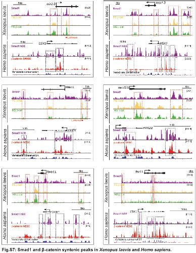 Fig.S7: Smad1 and β-catenin syntenic peaks in Xenopus laevis and Homo sapiens. Browser view of β-catenin and Smad1 peaks in Xenopus and human genes (from the following public data: GSM1505734 and GSM1579346). Red boxes indicate overlapping Smad1 and β- catenin peaks. Black boxes indicate syntenic peaks. |