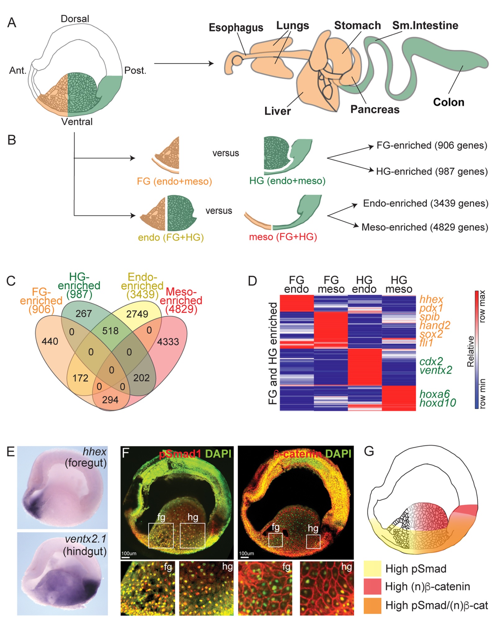 Fig. 1. Transcriptional program of FG and HG progenitors correlates with differential BMP and Wnt signaling. (A) Fate map showing that FG progenitors (yellow) give rise to lungs, liver, pancreas and stomach, whereas HG progenitors (green) give rise to intestine (Chalmers and Slack, 2000). (B) Experimental design. RNA-seq was performed on FG endoderm, FG mesoderm, HG endoderm and HG mesoderm explants dissected from stage NF20 Xenopus embryos. Differentially expressed transcripts were identified by pairwise comparisons of FG (endoderm and mesoderm) versus HG (endoderm and mesoderm), as well as endoderm (FG and HG) versus mesoderm (FG and HG) tissue (log2 FCâ¤â1 or â¥1, FDRâ¤5%). (C) Venn diagram showing the intersection of two separate differential expression analyses: FG versus HG and endoderm versus mesoderm, showing mutually exclusive lists of transcripts with enriched expression. (D) Heatmap clustering of the 906 FG-enriched and 987 HG-enriched genes showing expression in the indicated tissues with representative FG (orange) and HG (green) genes listed on the right. (E) In situ hybridization of sagittal bisected stage NF20 embryos with hhex and ventx2.1 marking the FG and HG domains, respectively. (F) BMP and Wnt activity shown by pSmad1 (red) and nuclear (n) β-catenin (red) immunostaining in NF20 embryos. Nuclei staining with DAPI (green). (G) pSmad1 is high in the ventral and low in the dorsal FG and HG, whereas nβ-catenin is low in the FG and high in the HG. FG/fg, foregut; HG/hg, hindgut; endo, endoderm; meso, mesoderm. Scale bars: 100 µm. |