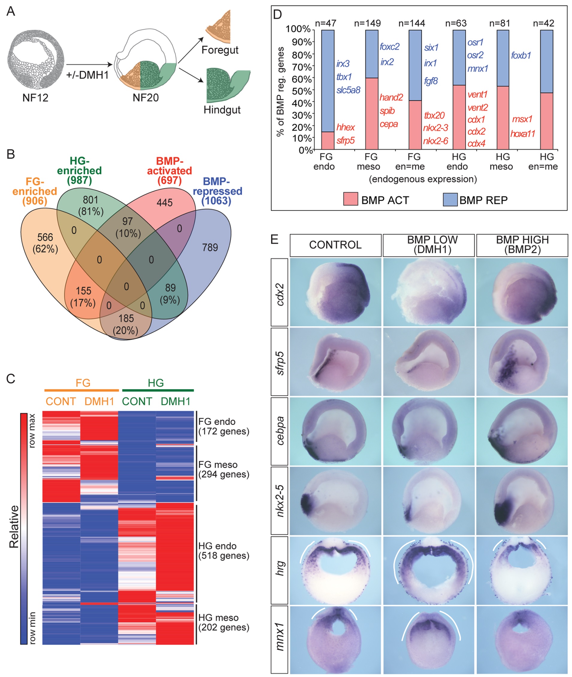 Fig. 2. BMP signaling coordinates D-V patterning. (A) Experimental design. FG and HG (endoderm plus mesoderm) explants were dissected from DMSO (vehicle)- or DMH1-treated NF20 embryos and submitted for RNA-seq (in triplicate). (B) Venn diagram showing overlap of FG-enriched genes, HG-enriched genes and BMP-activated and BMP-repressed transcripts (log2 FCâ¥1, FDRâ¤5%); see Fig. S2B for details. (C) Expression heatmap clustering of FG endoderm-, FG mesoderm-, HG endoderm- and HG mesoderm-enriched transcripts in vehicle-treated (CONT) or DMH1-treated explants. (D) Different categories of BMP-activated (ACT) or BMP-repressed (REP) transcripts based on whether the gene is normally enriched in the endoderm, mesoderm or expressed in both (en=me). (E) In situ hybridization of vehicle control-treated, DMH1-treated or BMP2-injected stage NF20 embryos in mid-sagittal section (cdx2, sfrp5, cebpa and nkx2-5; anterior left and dorsal up) or cross-section (hrg and mnx1; dorsal up; white lines indicate expression domain); n>20 for each probe. |