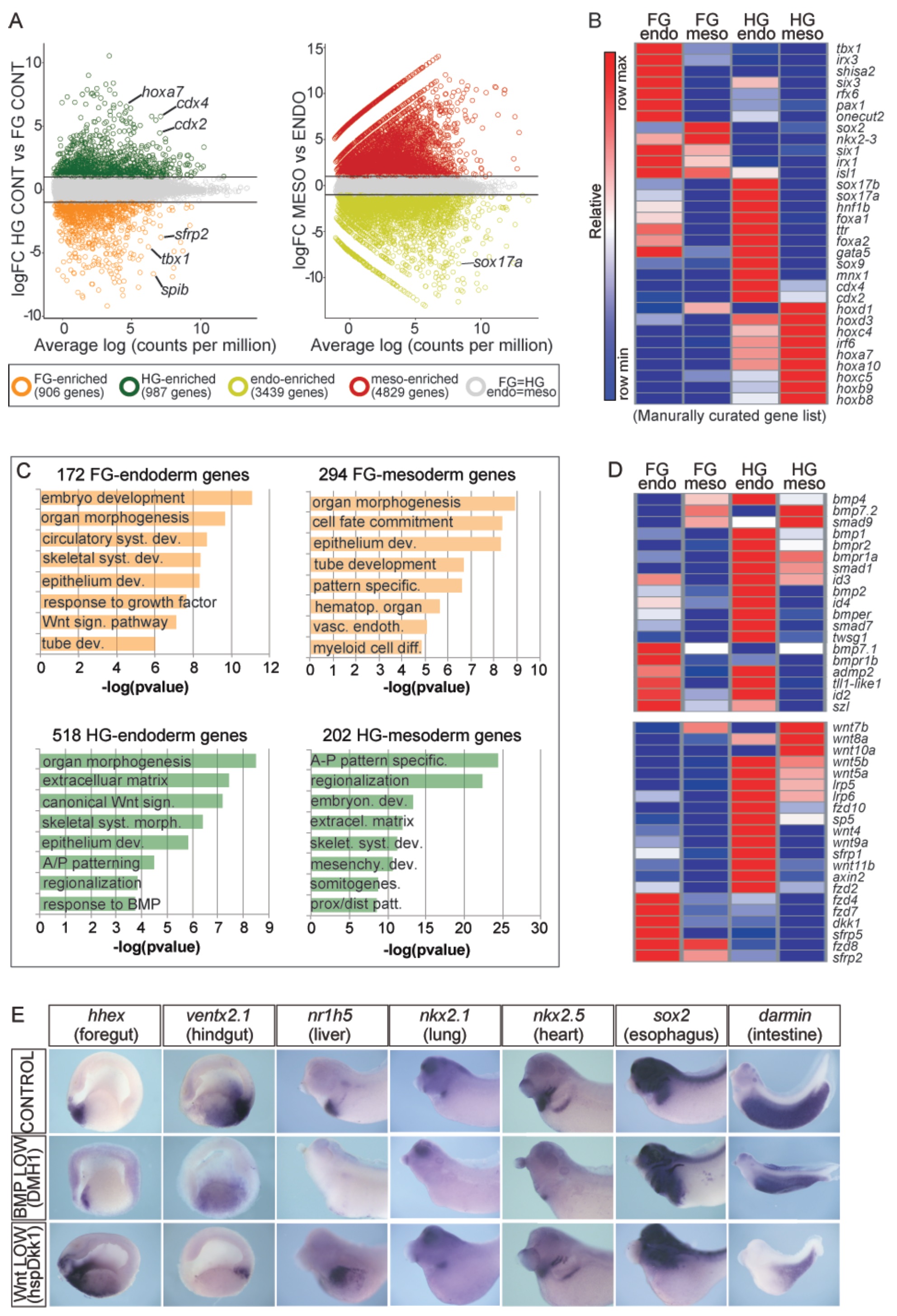 Fig. S1: Transcriptional program of FG and HG progenitors in vivo. (A) Scatter plot of log fold change (log2FC) in expression between HG versus FG samples and endo versus meso samples. HG-enriched transcripts (green), FG-enriched transcripts (orange) meso-enriched transcripts (red) and endo-enriched transcripts (yellow) based on log2 fold change (FC) â¤-1 or â¥1 and false discovery rate (FDR) â¤5%. (B) Xenopus orthologs of genes known to be involved in human and mouse GI development (manually curated list from the literature) are present in our FG-enriched and HGenriched gene lists. The heatmap shows that the Xenopus transcripts have restricted expression in manner predicted from the mouse and human literature, illustrating high conservation across species. (C) GO term enrichment analysis of 172 FG-endo, 294 FG-meso, 518 HG-endo and 202 HG-meso genes from Fig. 1C. (D) BMP and Wnt pathway components that are expressed in any sample (FG-endo, FGmeso, HG-endo or HG-meso) above one transcripts per-million reads (TPM >1; lower than this is considered not expressed). The heatmap shows that BMP pathway genes are expressed in both the FG and HG, whereas Wnt ligands are generally restricted to the HG and Wnt-antagonists enriched in the FG. (E) In situ hybridization of mid-sagittal section stage NF20 (hhex and ventx2.1) or NF35 embryos (nr1h5, nkx2-1, nkx2-5, sox2 and darmin) in DMH1 or Tg(hsp70:dkk1) embryos; anterior left and dorsal up. |
