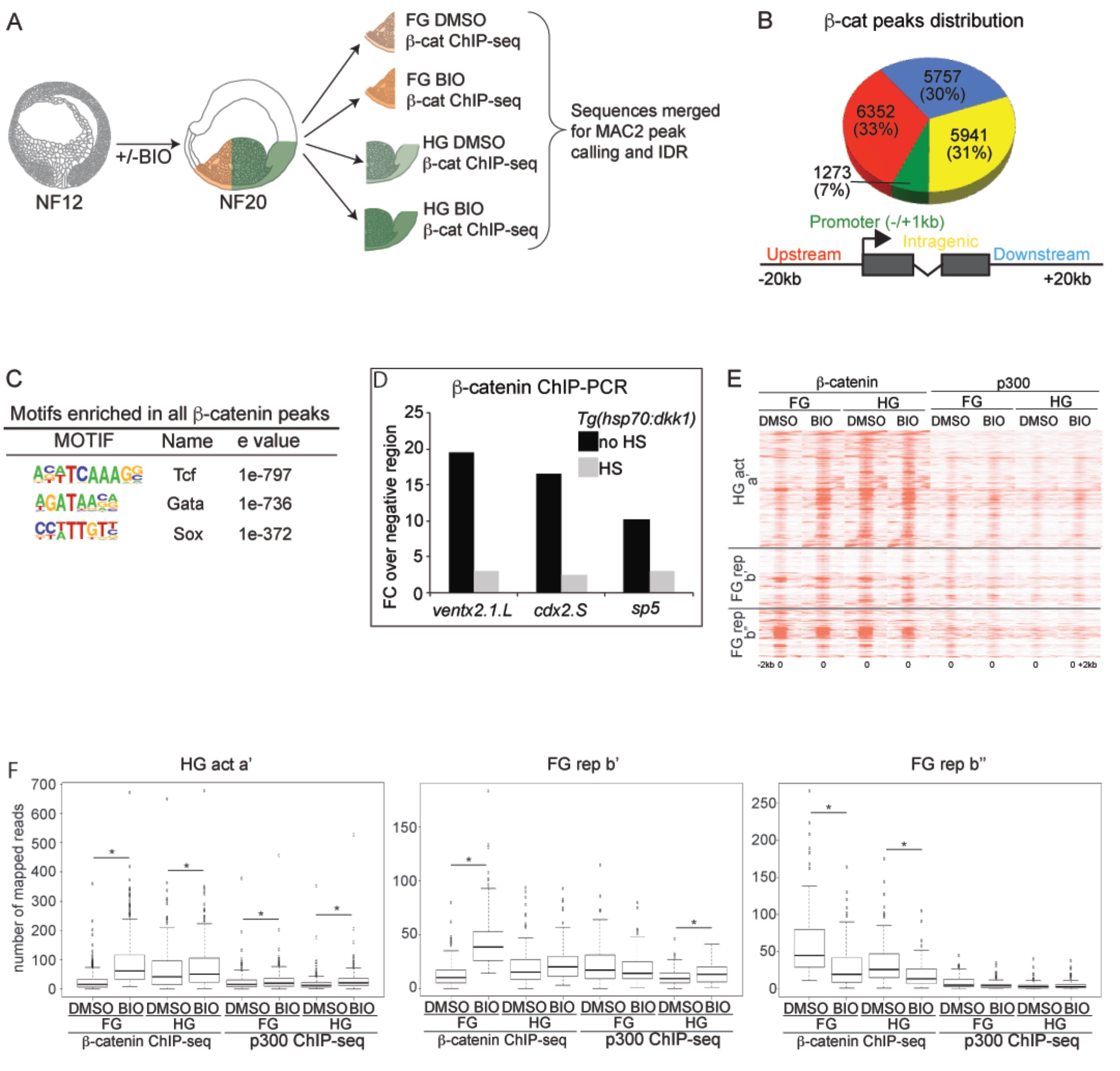 Fig. S5: β-catenin ChIP-seq of embryos stage NF20. (A) Experimental design showing β-catenin ChIP-seq of 100 FG or 100 HG explants dissected from DMSO vehicle control or BIO treated NF20 embryos. Reads were merged and MACS2 peak calling was performed followed by irreproducibility discovery rate (IDR) filtering with standard thresholds (Li et al., 2011) identified 16303 statistically significant peaks associated with 11007 genes (+/- 20 Kb from transcription start site) in the FG and HG samples. (B) Genomic distribution of β-catenin ChIP-seq peaks classified as upstream (-20kb), downstream (+20kb), intragenic and promoter (-1kb to +1kb) regions. (C) DNA-binding protein motif enrichment analysis of all β-catenin ChIP-seq peaks in the genome. (D) β- catenin ChIP-PCR of known CRMs in Wnt-target genes ventx2.1, cdx2 and sp5 from Tg(hsp70:dkk1) embryos with and without heat shock (HS). (E) Read density of different classes of β-catenin and p300 peaks in DMSO or BIO treated FG and HG explants from Fig. 5B. +/-2kb centered on the β-catenin peak summit. (F) Box plots of average tag density of β-catenin and p300 peaks on HG Wnt-activated genes (aâ), and FG Wnt-repressed genes (bâ and bâ) upon BIO treatment. *p<0.05, Wilcoxon test. |