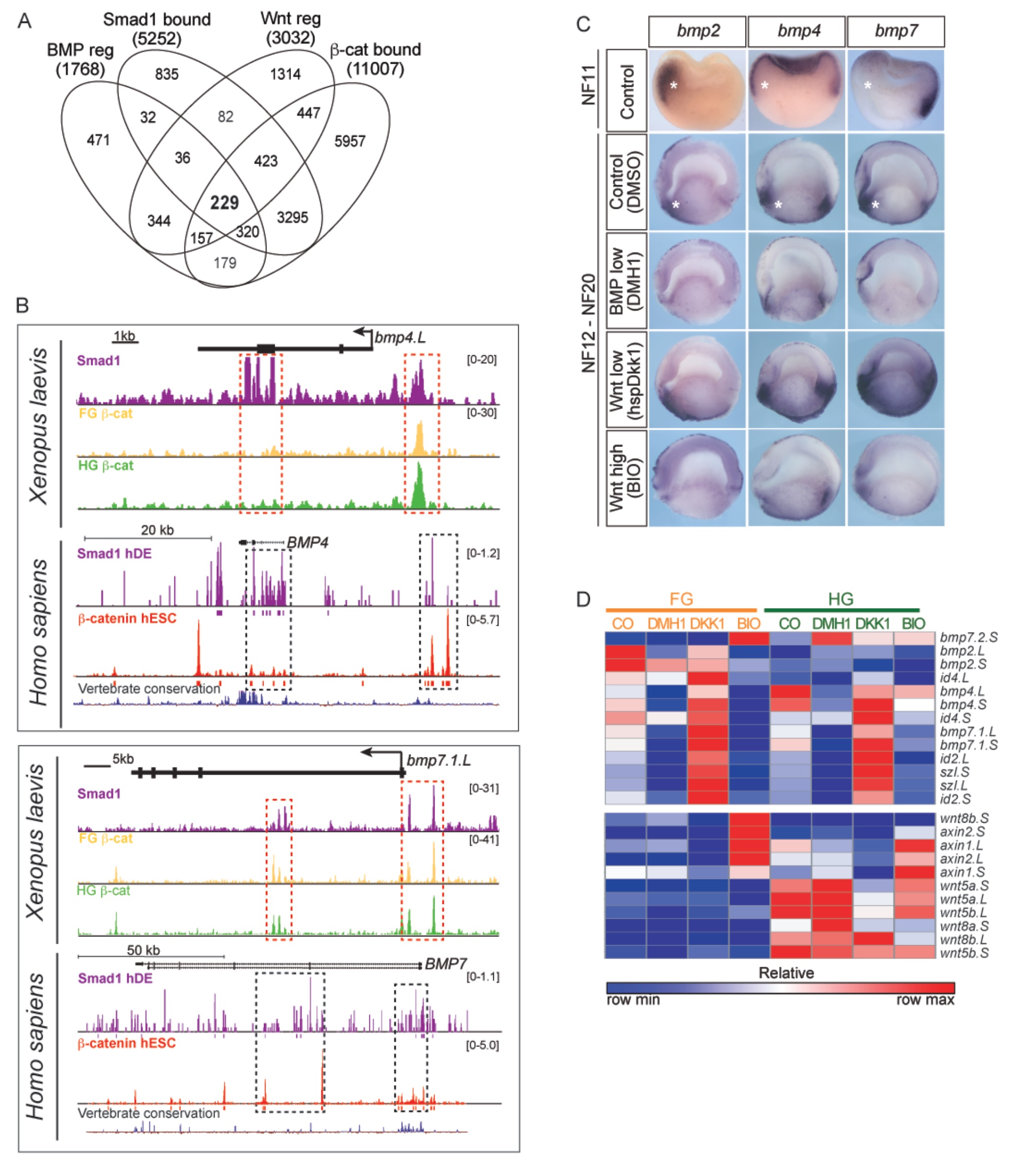 Fig. S6: BMP/Smad1 and Wnt/β-catenin crosstalk. (A) Overlap between BMP-regulated/Smad1-bound and Wnt-regulated/β-catenin-bound genes. (B) Browser view of β-catenin and Smad1 peaks in Xenopus and human genes (from GSM1505734 and GSM1579346). Red boxes indicate overlapping Smad1 and β-catenin peaks. Black boxes indicate syntenic peaks. (C) In situ hybridization of DMH1, Tg(hsp70:dkk1) and BIO treated embryos in mid-sagittal section, anterior left and dorsal up. Embryos are either stage NF12 wild-type or treated at stage NF11 and fixed at stage NF20. * indicates hhex-expressing FG cells. (D) Expression heatmap of BMP and Wnt ligands and targets present in FG and HG samples of controls (CO), DMH1, Tg(hsp70:dkk1) and BIO-treated embryos. |