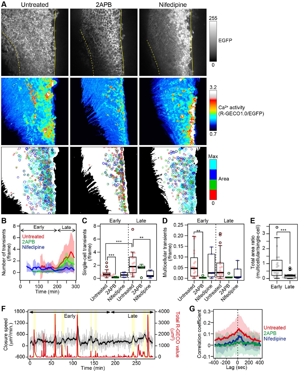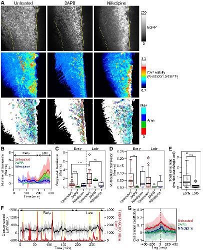 Fig. 3. Quantitative analyses of intracellular Ca2+ activities in the neural plate. (A) Representative results of quantitative analyses of a Ca2+ fluctuation in an untreated (left), 2APB-treated (middle) and nifedipine-treated (right) embryo. R-GECO1.0 and EGFP were introduced into the left side of the NPs. (Top) EGFP fluorescence images at the start of time-lapse recording; (middle) time projections of Ca2+ activity (R-GECO1.0/EGFP); and (bottom) time projections of reconstructed circles corresponding to the area of the Ca2+ transient, extracted by image processing. Solid yellow lines indicate the midline; dotted lines indicate the border between neural and non-neural tissues. The reconstructed circles were color-coded based on the quartiles of the area distributions in an untreated embryo. (B) The mean number of Ca2+ transients during NTC. The time interval of observations was 20 s. The data are shown as smoothed curves, obtained by averaging the originally counted numbers at a given time point with those of neighboring time points (50 time points total). The shaded area indicates the s.d. (C) The number of single-cell Ca2+ transients in the early and late phases of NTC. **P<0.01 and ***P<0.001, two-sided MannâWhitney U-test. (D) The number of multicellular Ca2+ transients in the early and late phases of NTC. **P<0.01, two-sided MannâWhitney U-test. (E) The ratio of the total area of the multicellular or single-cell Ca2+ transients in the early and late phases of NTC in untreated embryos. ***P<0.001, two-sidedWilcoxon signed rank test. (F) Representative data for the closing speed (black) and the total R-GECO1.0 intensity values at the tissue level (red) during NTC. The closing speed is shown as a smoothed curve, obtained by averaging the rate determined from image analyses (gray) at a given time point with those of neighboring time points (ten time points total). Overlaps between temporary increases in closing speed and intense Ca2+ transients are highlighted (yellow). (G) Mean cross-correlation coefficients between the closing speed and the total R-GECO1.0 value. The shaded area indicates s.d. n=19 (untreated), 5 (2APB-treated) and 6 (nifedipine-treated) embryos. Results in B-E andGare for the same data set. In C-E, the box and whiskers of these plots indicate maximum, third quarter, median, first quarter and minimum values of each group, respectively, from upper side to the bottom of the graphs. Data beyond the end of the whiskers, the upper limit of whiskers is 1.5 times the box length, are shown as outliers. |