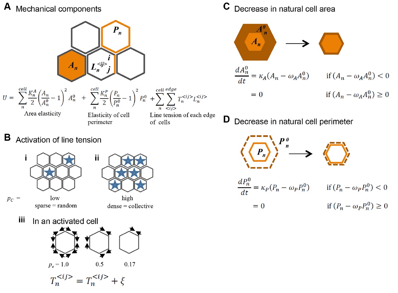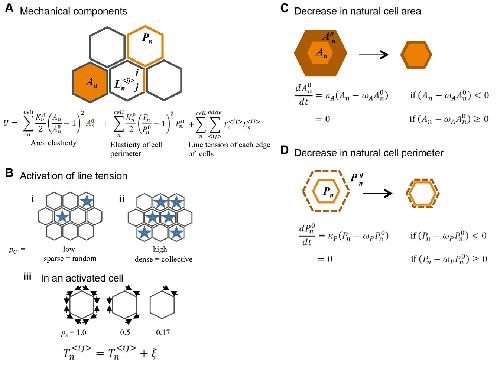 Fig. 6. Schematic representation of the vertex model. (A) The mechanical potentials are shown with five cells. (B) Effect of the Ca2+ transient is described. The Ca2+ transients at the single-cell (i) and multicellular (ii) levels are shown. Cells marked by blue stars are activated. Activated cellular edges in an activated cell are marked by arrows (iii). (C,D) The constrictive nature of the apical cell surface with a ratchet-like stabilization is modeled by two differential equations. The regulation of the natural cell area and of the natural cell perimeter are described in C and D, respectively. The bright orange regions in C are the actual cell surface area, and the dark orange regions correspond to the natural cell surface area. The bright orange lines in D are the actual cell perimeter, and the dark orange broken lines correspond to the natural perimeter. See main text and Supplementary Materials and Methods for the detail. |