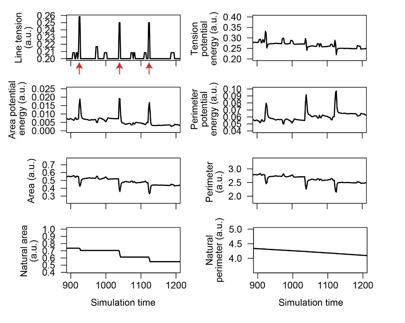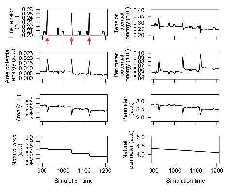 Figure S4. Temporal changes in parameters of single cell in modeled epithelial sheet. Mean line tension, potential energy from line tension, potential energy from the elasticity of apical surface area, potential energy from the elasticity of apical perimeter, apical surface area, apical perimeter, natural area, and natural perimeter of single cell (#58) during the time course of the simulations with the combination of pulse and Acn components. Arrows indicate periods with pulses. |