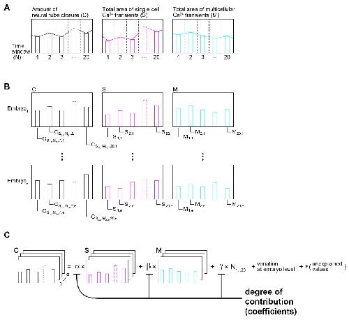 Figure S7. Schematic workflow for statistical validation of prediction from simulation using observations in vivo. (A) Temporal profiles of closing movement, the total area of single-cell Ca2+ transients, and multicellular Ca2+ transients during last 200 minutes before the completion of NTC. (B) Generation of data set for statistical analysis by dividing temporal profiles into twenty time windows. (C) Fitting mixed linear model to the data set to estimate contributions. See Supplementary Materials and Methods for the detail. |