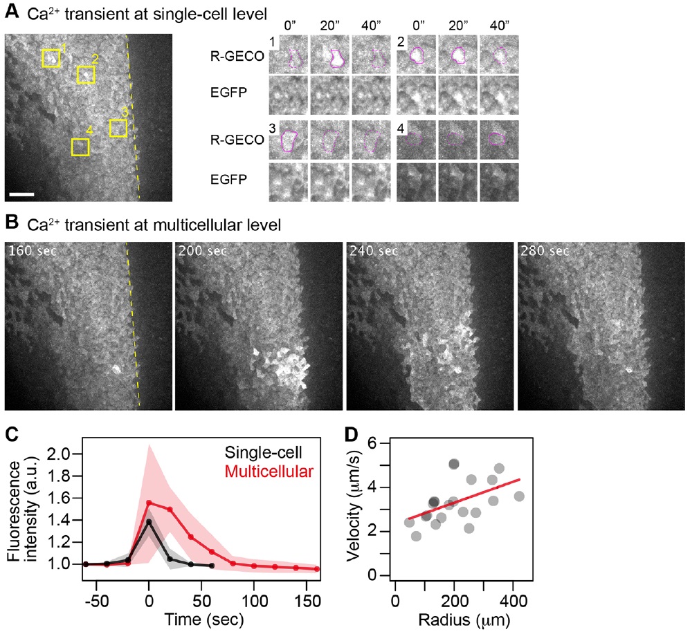 Fig. 2. Live-imaging analyses of intracellular Ca2+ in the neural plate. (A) A Ca2+ transient at the single-cell level, visualized with R-GECO1.0 (gray), in a dorsal view of the presumptive anterior spinal cord region; anterior is to the top. R-GECO1.0 was introduced on the left side of the embryo. The midline is indicated by a dotted line. A time course over a 40 s period of four sample cells (which are indicated in the figure) is shown in the right panels. Scale bar: 100 μm. (B) Time-lapse imaging data of a multicellular, wave-like Ca2+ transient in the embryo shown in A. (C) Fluorescence intensities of cytoplasmic R-GECO1.0 over time; the shaded area indicates the s.d. In multicellular Ca2+ transients (red), cells adjacent to the cell that was initially activated were measured (n=6 cells). (D) The radius and velocity of wave propagations in multicellular Ca2+ transients. The red line represents the relationship between the two data sets, calculated using the least-squares method of linear regression (n=21 cells, five embryos). |