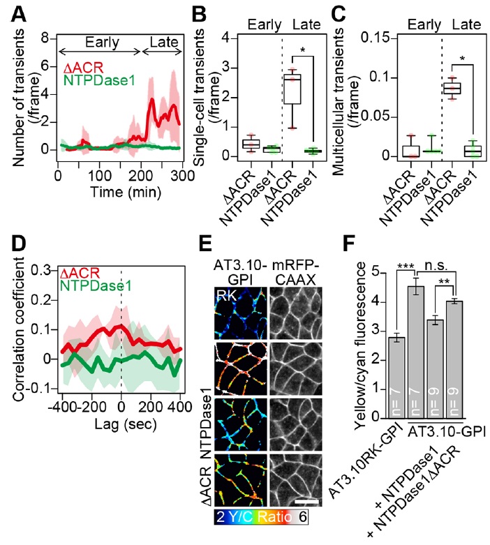 Fig. 4. Extracellular ATP in Ca2+ fluctuations and NTC. (A) Mean number of Ca2+ transients in embryos expressing an E-NTPDase1 mutant (δACR; red) or E-NTPDase1 (NTPDase1; green), shown as smoothed curves obtained by averaging the originally counted values at a given time point with those of neighboring time points (25 time points total). Time interval of observations is 40 s. Shaded area indicates the s.d. (B) Number of single-cell Ca2+ transients in the early and late phases of NTC. *P<0.05, two-sided MannâWhitney U-test. (C) Number of multicellular Ca2+ transients in the early and late phases of NTC. *P<0.05, two-sided MannâWhitney U-test. (D) The mean cross-correlation between the closing speed and the total R-GECO1.0 value in embryos expressing a mutant E-NTPDase1 (δACR; red) or E-NTPDase1 (NTPDase1; green). The shaded area indicates s.d. n=3 (δACR), 5 (NTPDase1) embryos. Results in A-D are for the same data set. (E) Images showing the yellow-tocyan (yellow/cyan; Y/C) fluorescence ratio value of AT3.10RK-GPI (top, control), AT3.10-GPI (second to bottom) on the surface of NP cells, by FRET analysis (left). The mean ratio was measured from the masked region generated by membrane-targeted mRFP (right). Scale bar: 30 μm. (F) The mean yellow-to-cyan fluorescence ratio value of AT3.10-GPI on cell surfaces in the NP by FRET analysis. The number of embryos examined is indicated in each bar. Error bars show s.e.m. **P<0.01 and ***P<0.001, two-sidedWelchâs t-test. n.s., not significant. In B and C, the box and whiskers of these plots indicate maximum, third quarter, median, first quarter and minimum values of each groups, respectively, from upper side to the bottom of the graphs. |